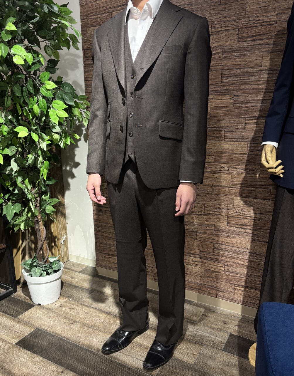オーダーでこそ作れる短丈ワイドパンツスーツ S.H様 オーダースーツSADA 丸井錦糸町店 投稿日 2026年1月5日 NEW! 最終更新日 2026年1月5日 3つ釦段返り3ピーススーツ 生地素材 ELEGANCE 7-6840 ブラウンシャドーストライプ 裏地 ペイズリーこげ茶色 SU653 ボタン ブラウン光沢釦 K-48 オプションその他 スタイリッシュなスラントポケット クラシックなチェンジポケット 袖口重ね釦 脚長効果のある短めな着丈 ワイドで弱フレアなシルエットのパンツ 担当スタイリスト 成田