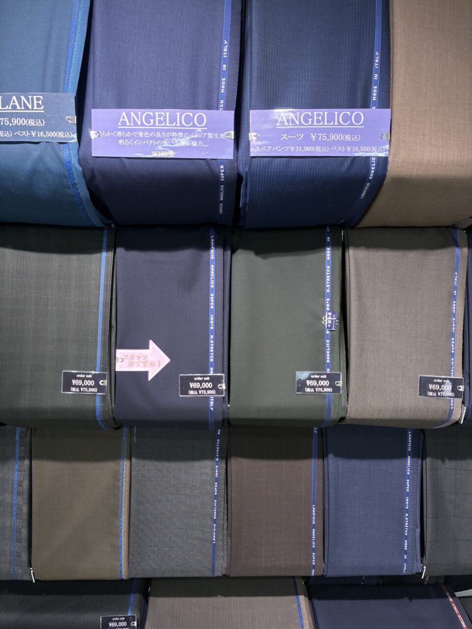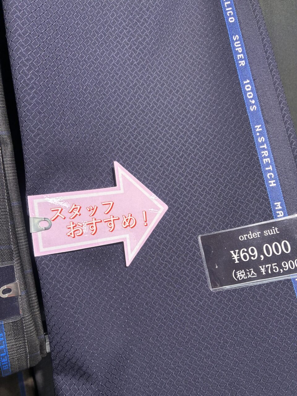 中でもスタッフおすすめ!のPOPが付いているこちらの生地は、柄の効果で光沢が出るので高級感のあるスーツに仕上がります!