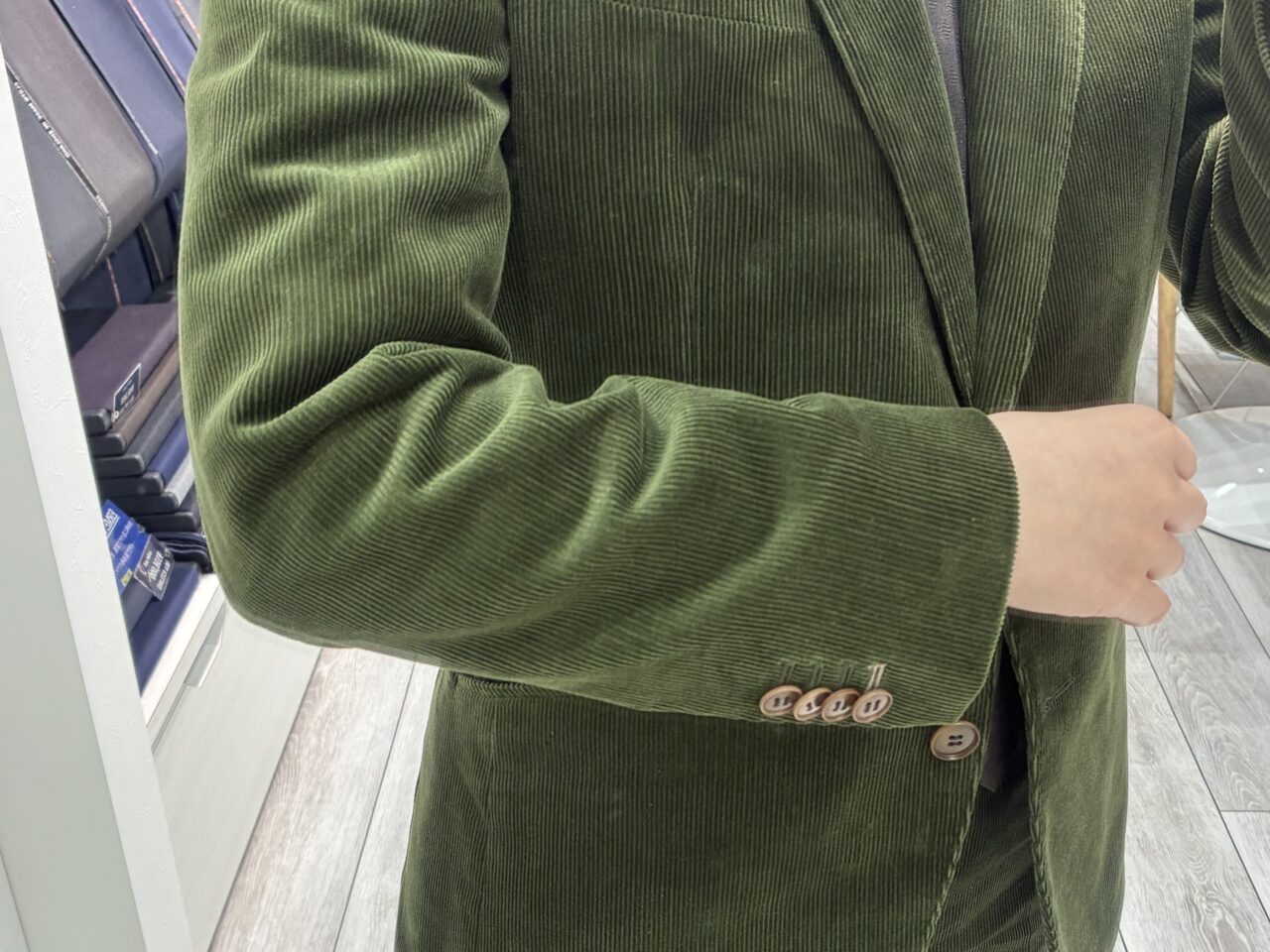 グリーン×コーデュロイ素材のスーツです!