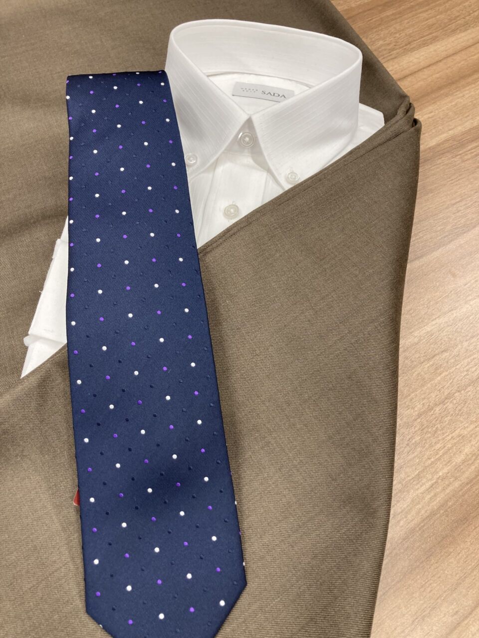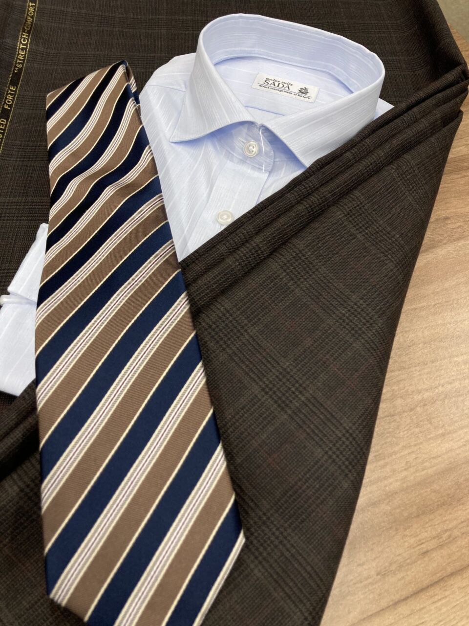 合わせるシャツの色はブルー系がおすすめ。ネクタイは同じブラウン系を選ぶとすっきりとした印象になるでしょう。