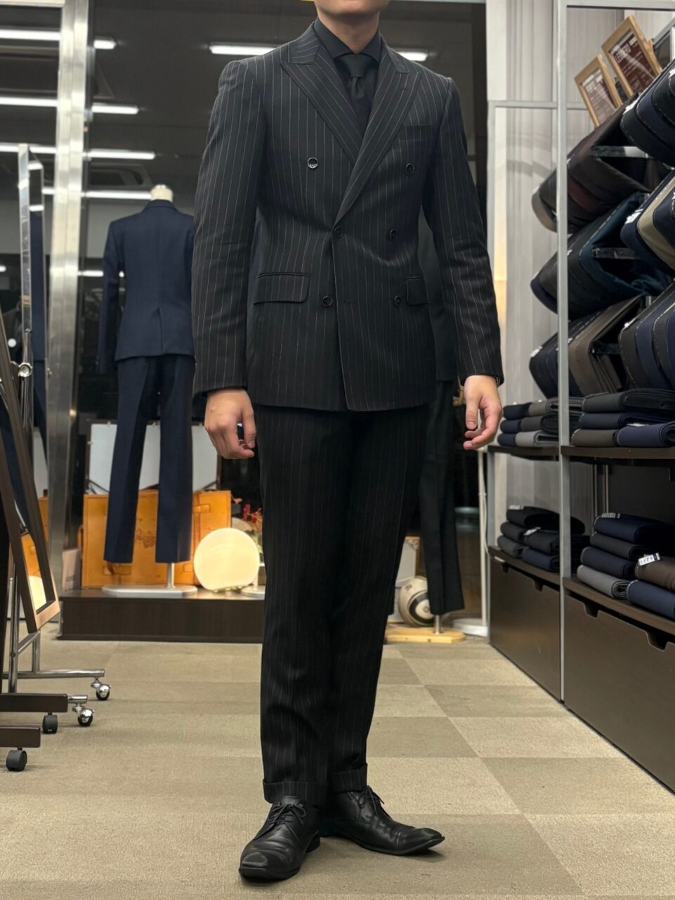 黒のストライプ生地に光沢の強いボタンを合わせたダブルスーツ!