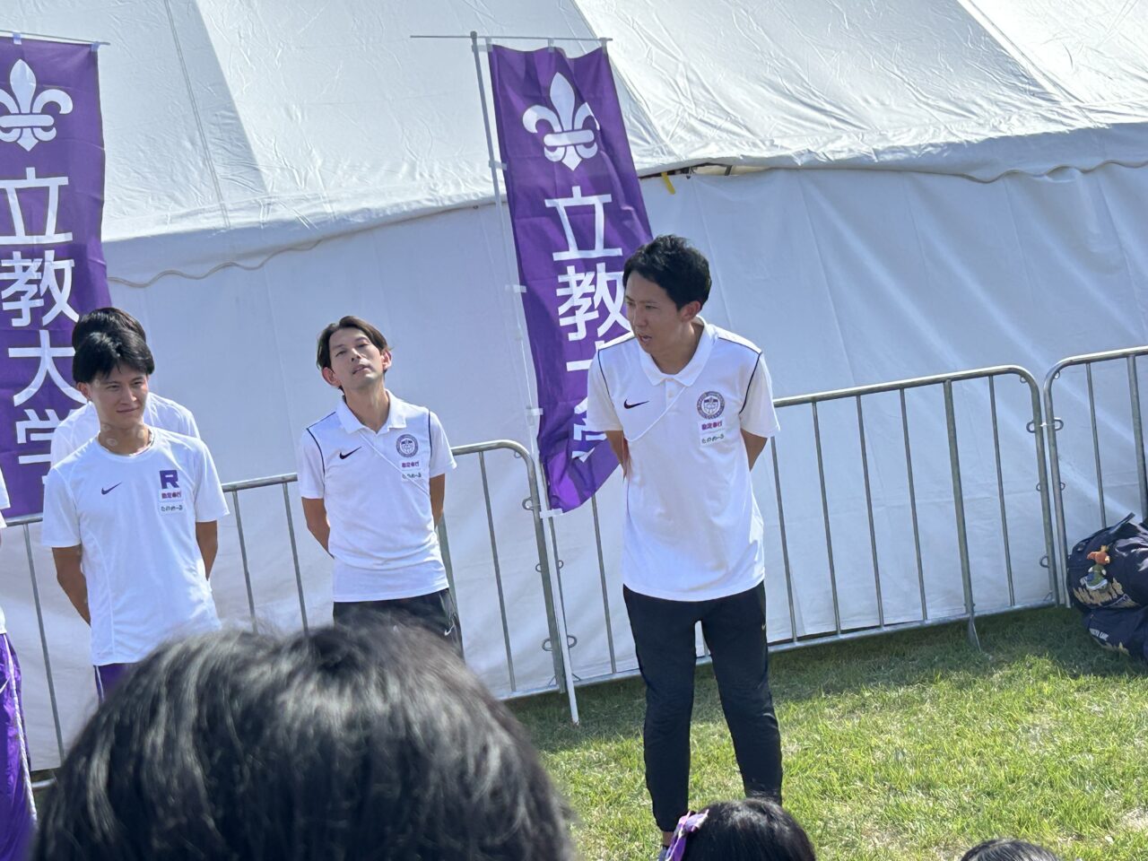 この後、後方の立教のテントに移動し、監督、選手の報告会がありました。