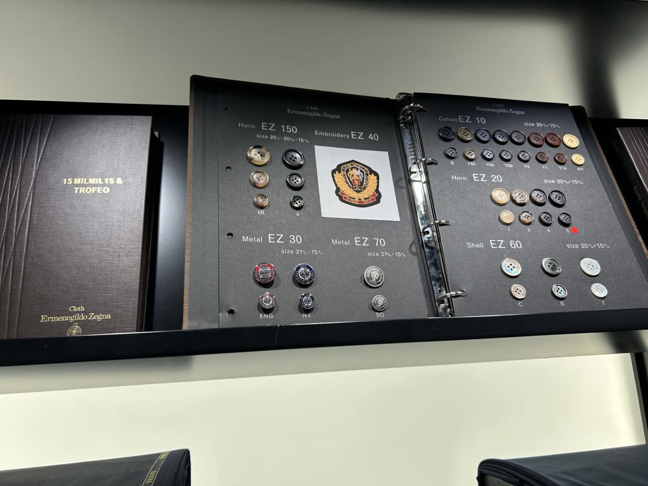 エルメネジルド・ゼーニャの生地だけでなく、釦やエンブレムなどの付属品も豊富に扱っています。