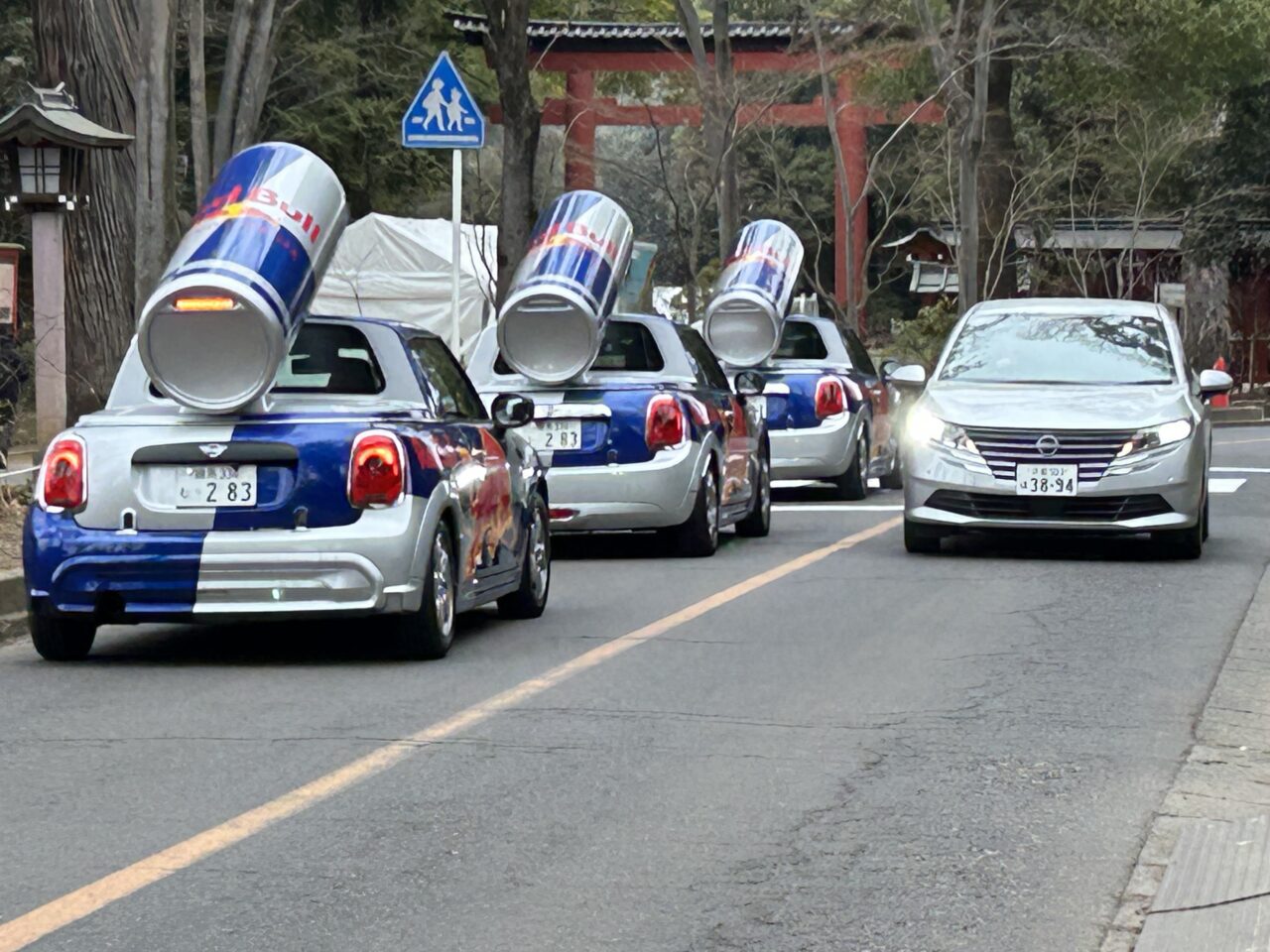 スタジアムに向かって、氷川参道を歩いているとRed Bullのデモカーが3台通り過ぎました。