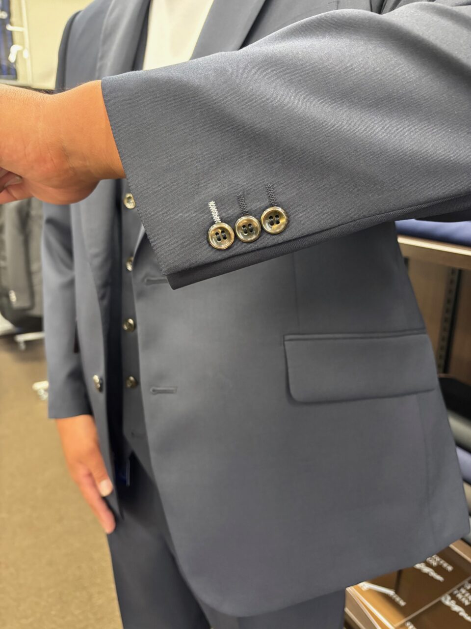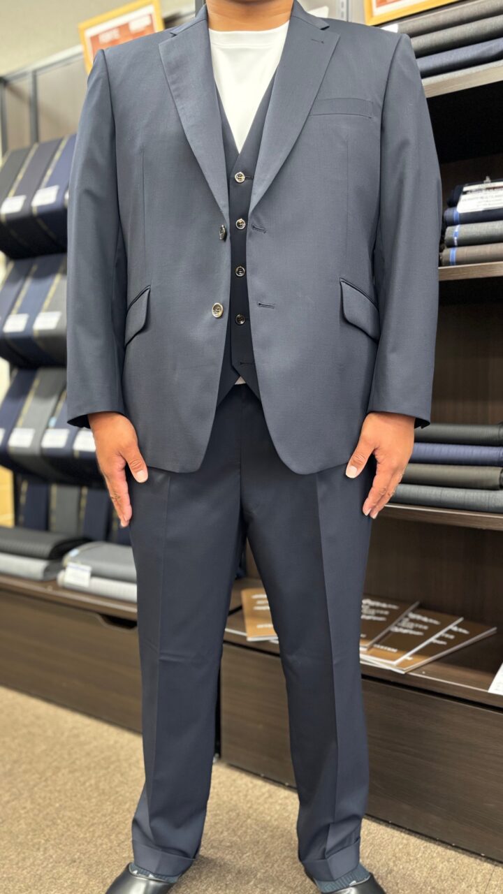 細部にこだわる!ネイビーのスリーピーススーツ