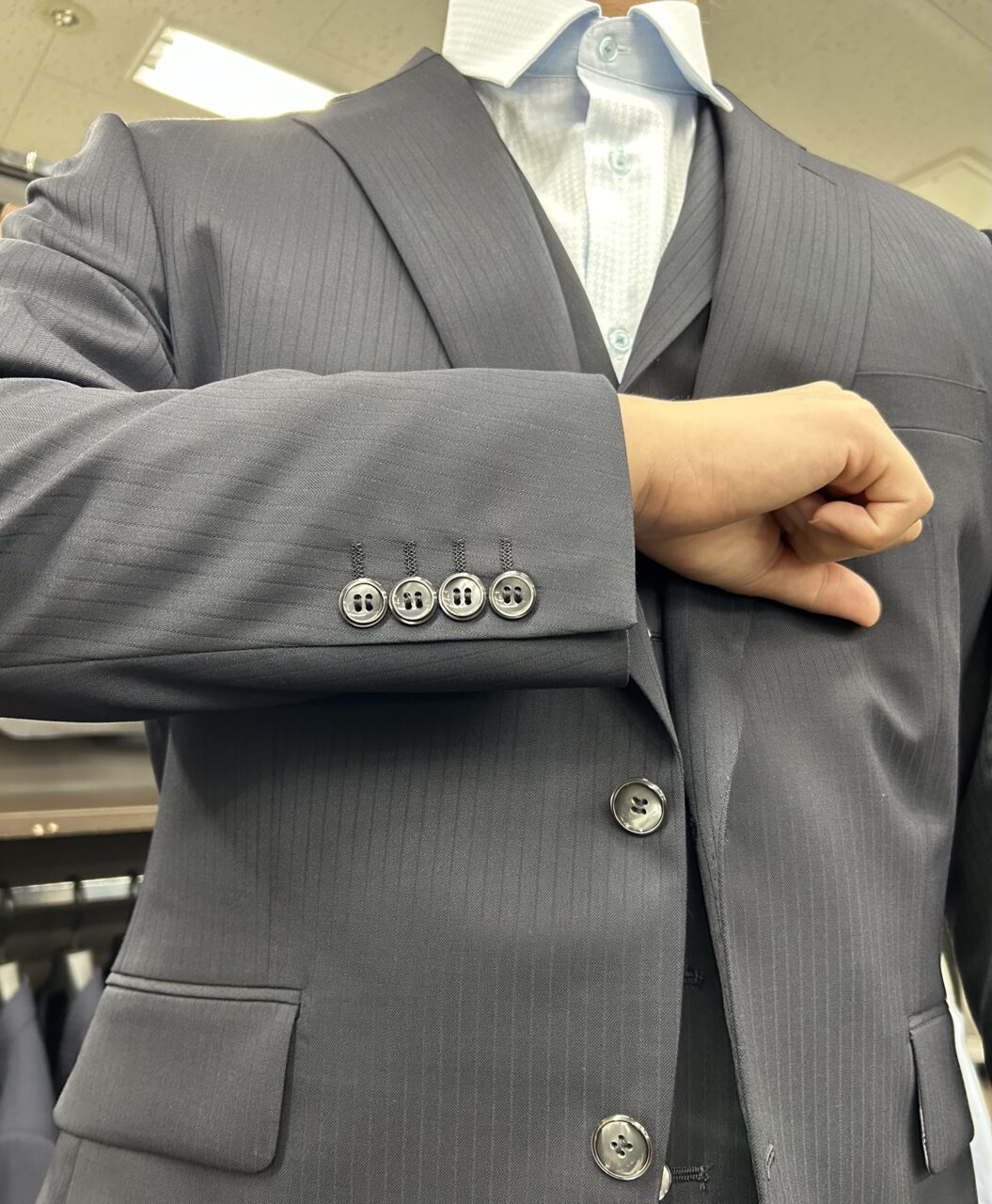 落ち着きのあるネイビースーツ 裏地釦でアクセントを