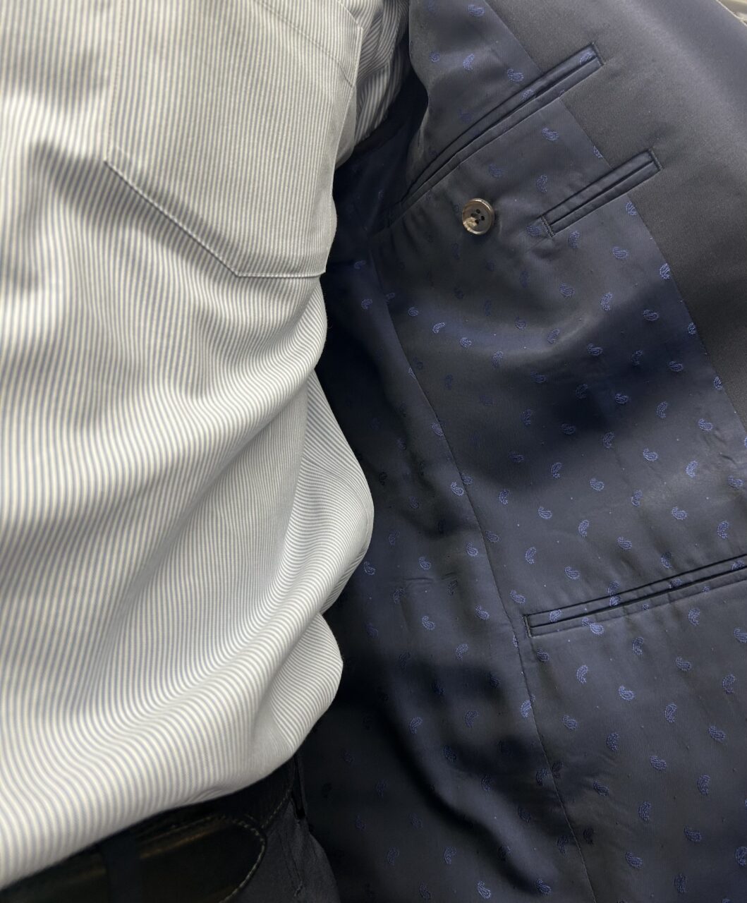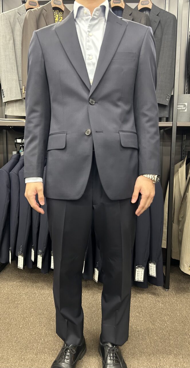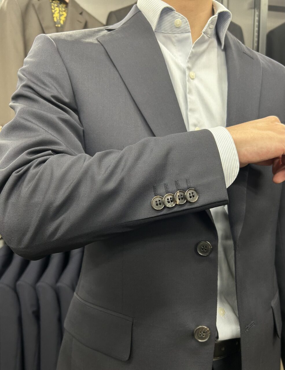 シンプルな紺無地スーツ。釦裏地で高級感を演出
