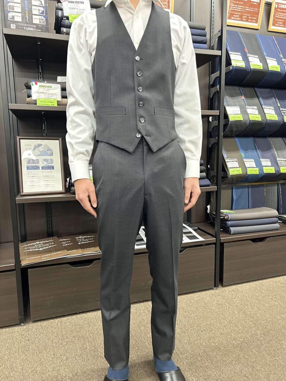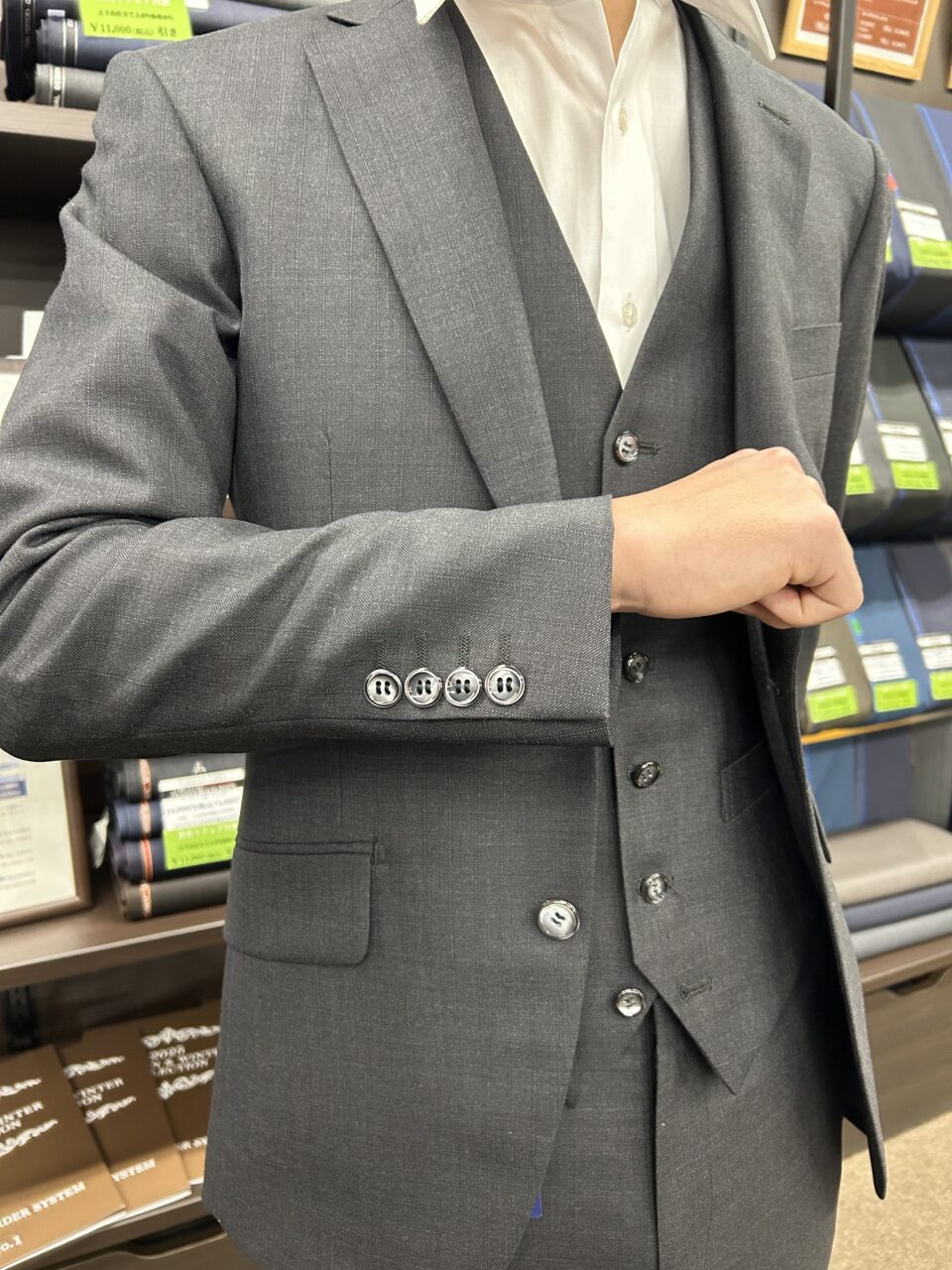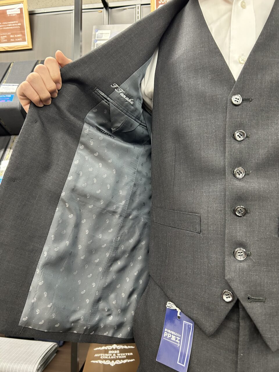 成人式用 光沢のあるグレースーツ。上品な仕上がり