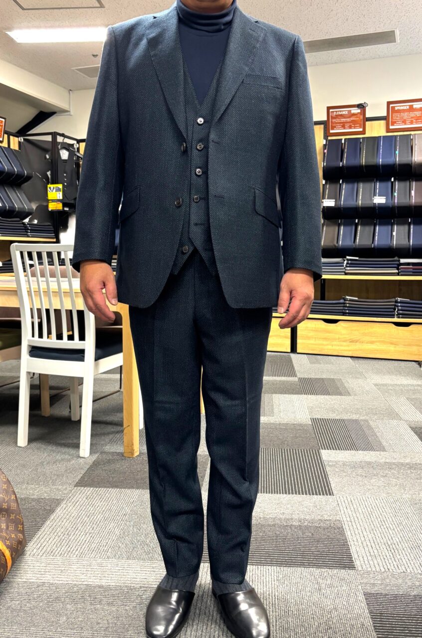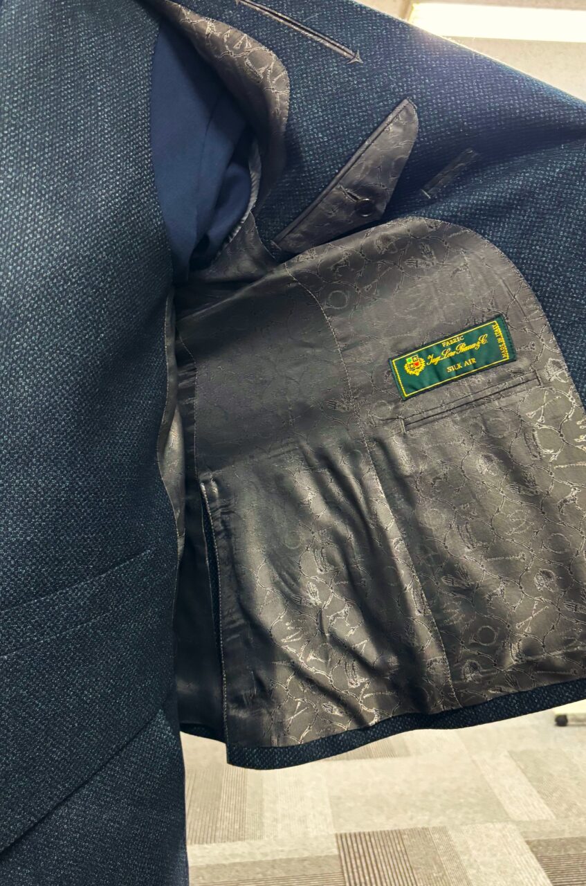 今回、2度目のご来店のT様。今回はパーティ参列用にイタリア輸入生地「Loro Piana社」の<SILK AIR>(Wool86%SILK10%CASHMERE4%)のエメラルドグリーン色バーズアイ柄の生地で3つ揃えのスーツと別でオーダーシャツ1枚をご注文いただきました。また裏地はイタリア輸入裏地「ARIA AZZURRO」をお選びいただきました。イタリア輸入生地Loro Piana社」の<SILK AIR>・裏地「ARIA AZZURRO」は何とも言えない美しさと色気を醸し出します。今回は上下の寸法だけではなく、上下のバランスに注意しながら、採寸させていただきました。。結果、適度なゆとりをとりながら、身体に沿った美しいシルエットのオーダースーツが仕上がりました。