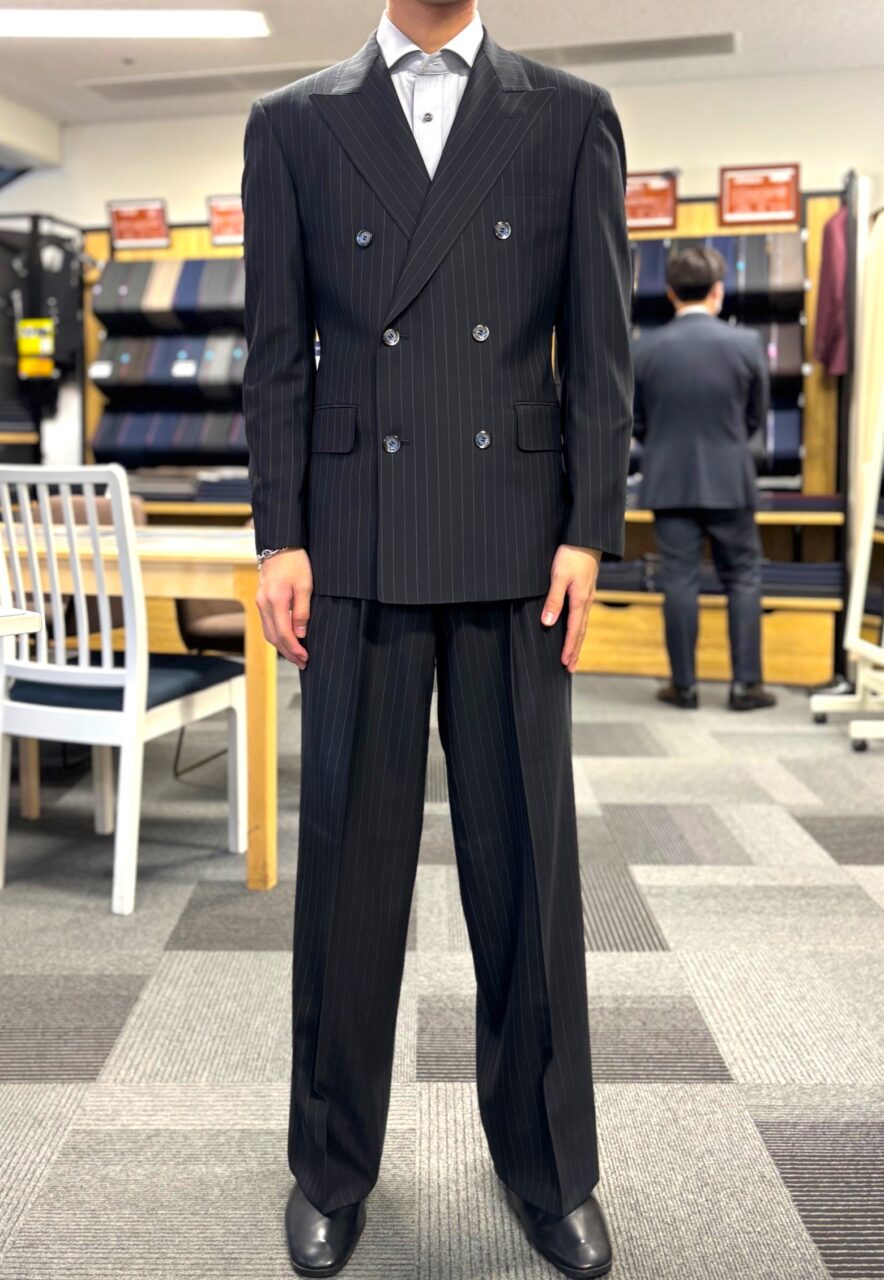 今回、初めてSADAをご利用いただいたN様。今回は成人式参列用のオーダースーツとシャツをご注文いただきました。昨今、ご要望が増えているワイドフォルムのダブルブレストスーツのご注文です。細身体型のN様なので、ワイドシルエットによるシワ等が出ない様に採寸者もがんばりました。結果、適度なゆとりをとりながら、身体に沿った美しいワイドシルエットのオーダースーツが仕上がりました。
