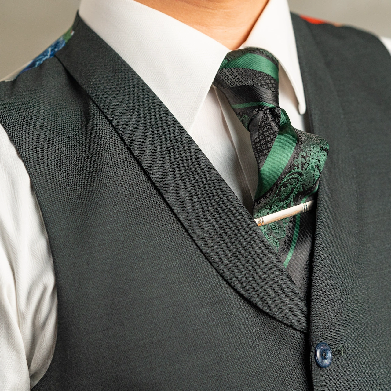 ダブルスーツの標準仕様であるピーク衿をベストに追加。エレガントな印象が増します。