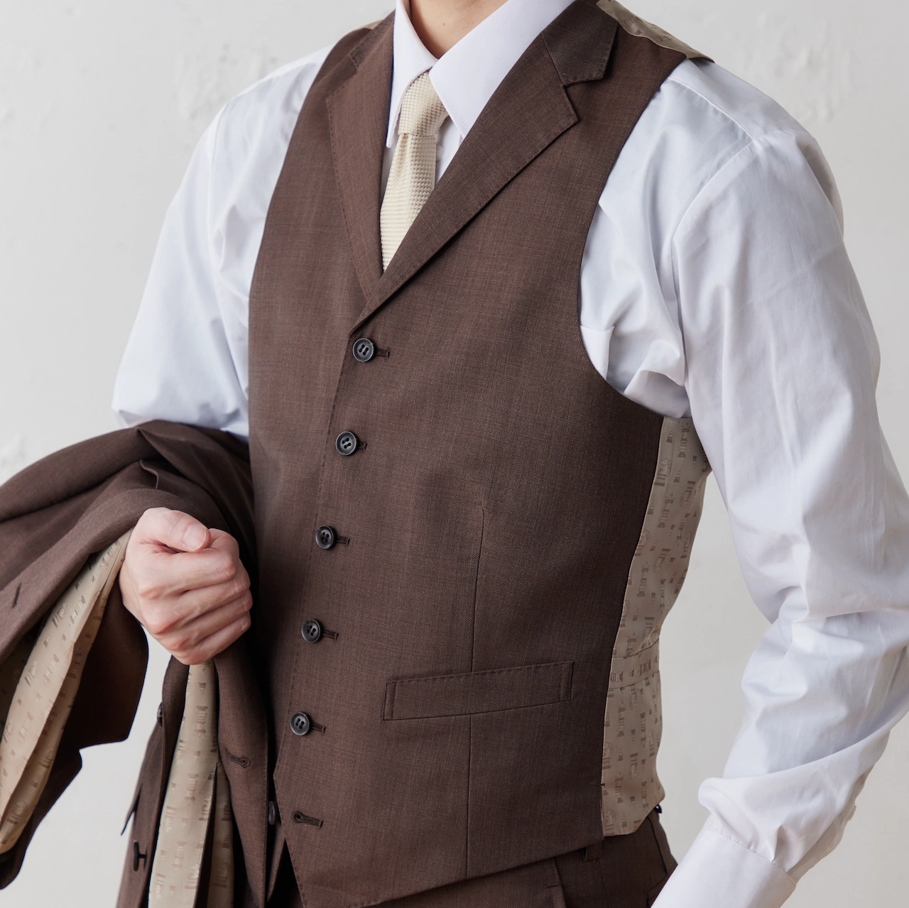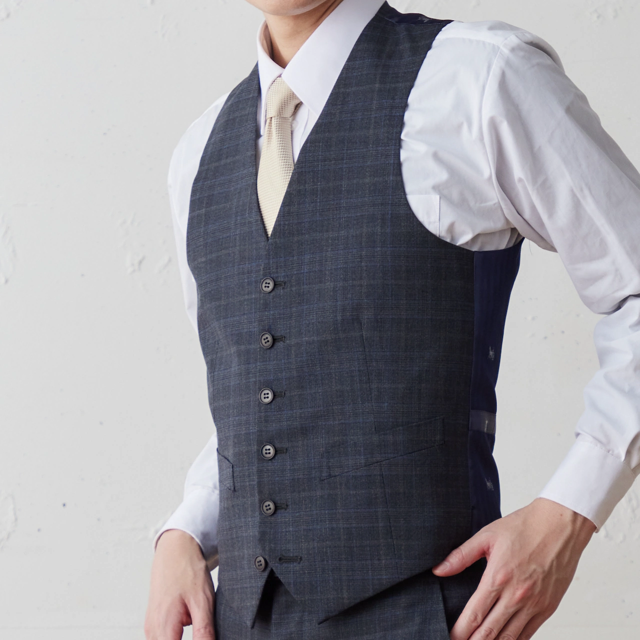 スーツの標準仕様であるノッチ衿をベストに追加。汎用性の高いデザインです。