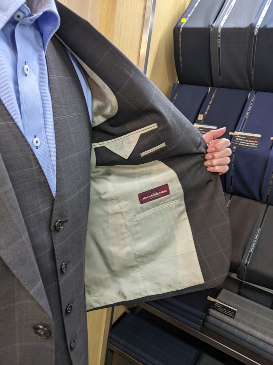 茶系・イタリア輸入生地(ALBINO TORELLO VIERA社)&ペイズリー柄裏地 A・H様/20代/男性 オーダースーツSADA 大阪堺店 投稿日 2026年3月29日 NEW! 最終更新日 2026年3月29日 皆さまこんにちは! オーダースーツSADA堺店です。 今回もお客様の素敵なスーツをご紹介します。 2ボタン シングル3ピーススーツ 生地素材 【ブランド名】ALBINO TORELLO VIERA 【色柄】ブラウン×ストライプ 【シーズン】春夏 裏地 【組成】キュプラ100% 【色柄】ベージュ系×ペイズリー柄 ボタン 【色柄】ブラウン×サンダーボタン オプションその他 AMFステッチ 本台場仕立て PP加工 シック加工 Ⅾカン留 アームシック 担当スタイリスト