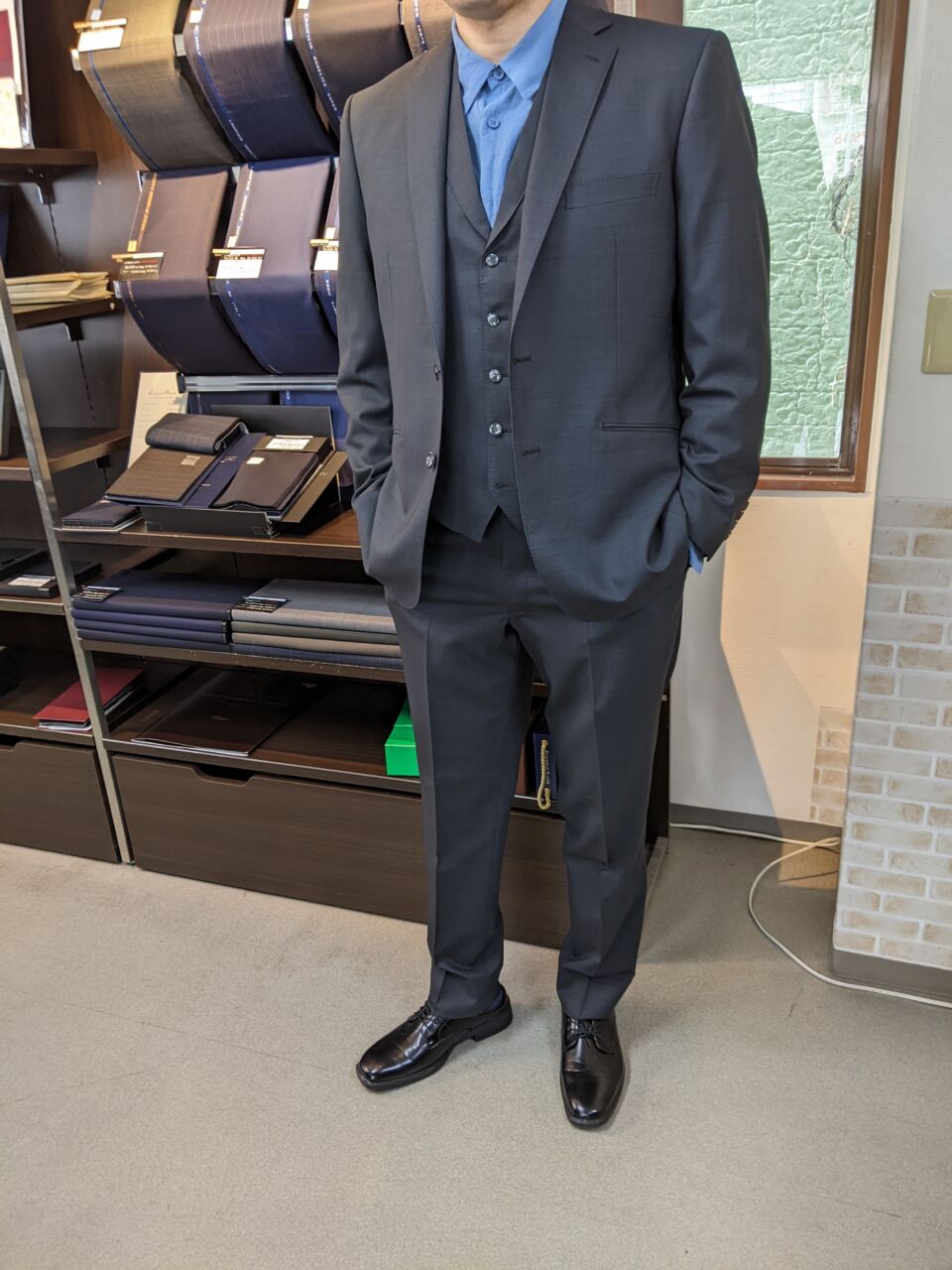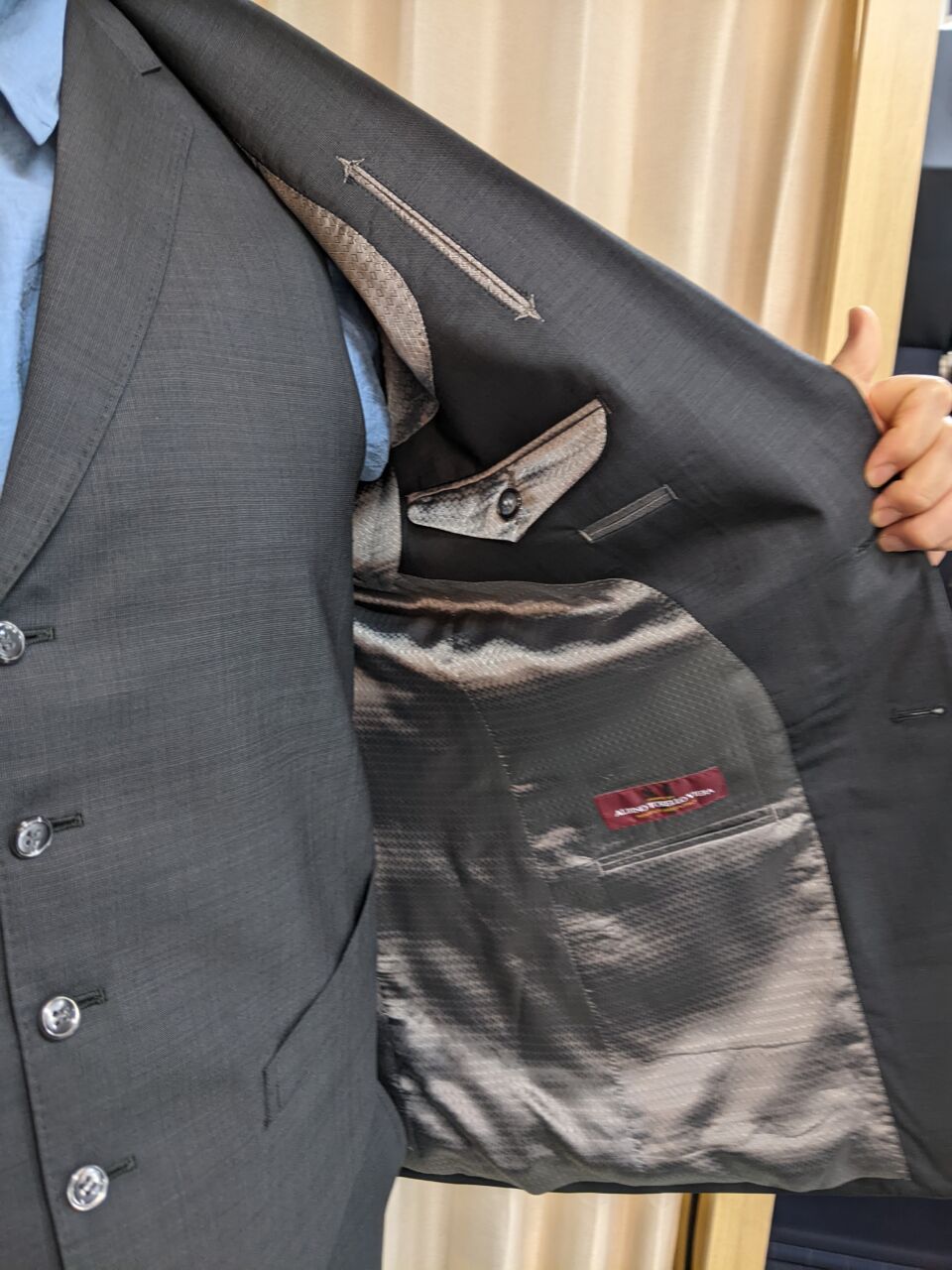 ハイグレード仕立て 茶系・イタリア輸入生地(ALBINO TORELLO VIERA社)&ドビー柄裏地 T・T様/40代/男性 オーダースーツSADA 大阪堺店 投稿日 2026年3月30日 NEW! 最終更新日 2026年3月29日 皆さまこんにちは! オーダースーツSADA堺店です。 今回もお客様の素敵なスーツをご紹介します。 2ボタン シングル3ピーススーツ 生地素材 【ブランド名】ALBINO TORELLO VIERA 【色柄】グレー×無地柄 【シーズン】春夏 裏地 【組成】キュプラ100% 【色柄】グレー系×ドビー柄 ボタン 【色柄】シルバー×サンダーボタン オプションその他 衿付きベスト AMFステッチ 本台場仕立て PP加工 シック加工 Ⅾカン留 アームシック 担当スタイリスト