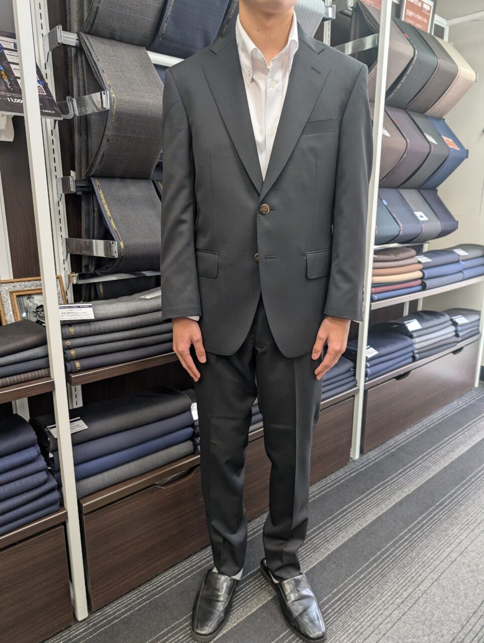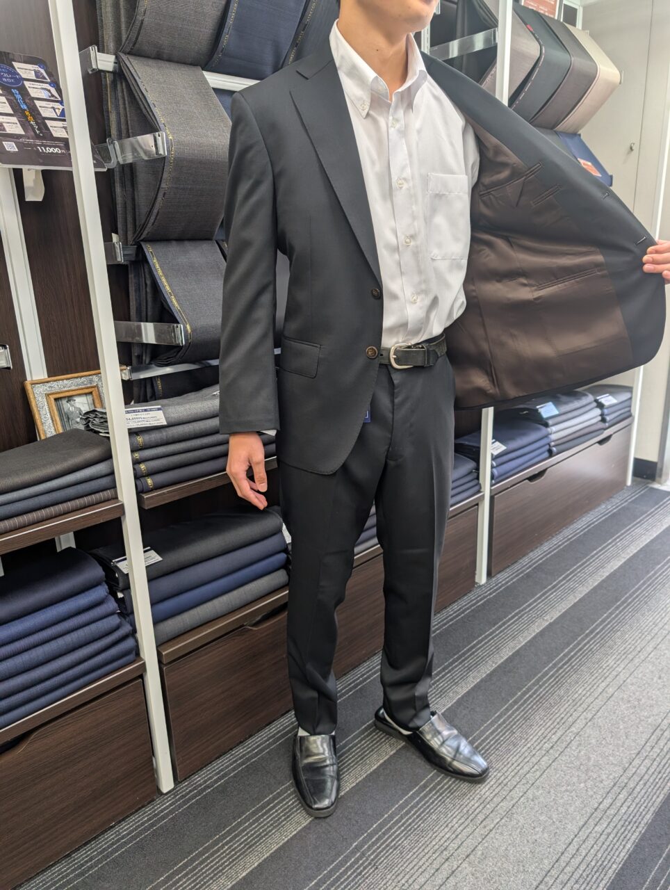 定番の黒無地のスーツで洒落て茶色の装飾を。 オーダースーツSADA 大阪谷町店 投稿日 2025年12月23日 最終更新日 2025年12月23日 2ボタンシングルスーツ 生地素材 ・素材名 ソリッド ・色 クロ ・柄 ムジ ・シーズン 通年 ・生地番号 8-2195 裏地 ・素材名 キュプラ100% ・色 茶 ・柄 ムジ ボタン ・素材 オーバル ・色 こげ茶 オプションその他 ・PP加工 ・AMFステッチ 担当スタイリスト