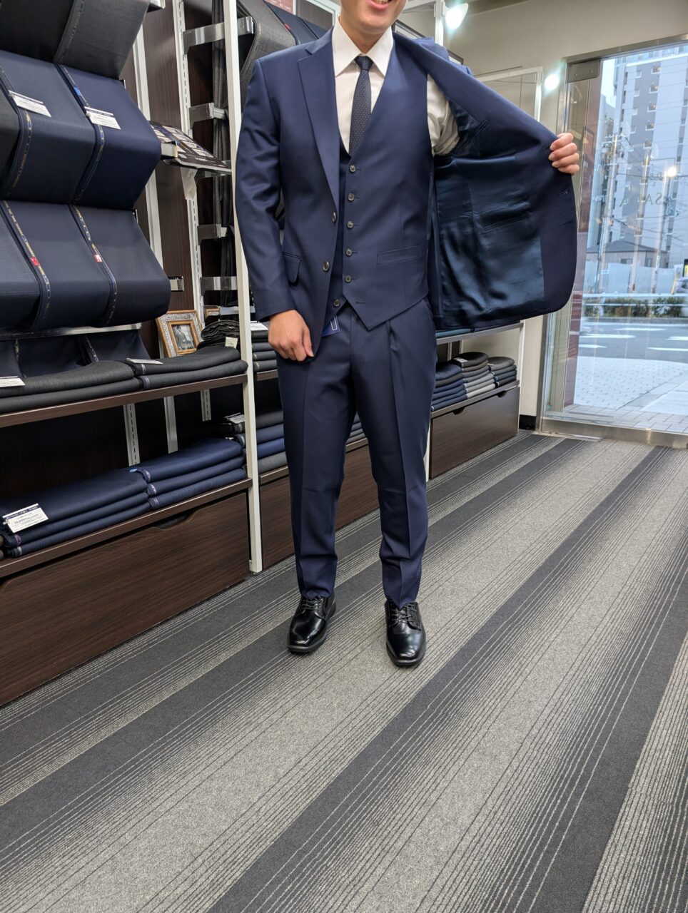 爽やかでフレッシュ感満載のエレガンススーツ オーダースーツSADA 大阪谷町店 投稿日 2026年1月31日 NEW! 最終更新日 2026年1月31日 2ボタンシングルスリーピース 生地素材 ・素材名 エレガンス ・色 ブルー ・柄 ムジ ・シーズン 秋冬 ・生地番号 7-6832 裏地 ・素材名 キュプラ100% ・色 ブルー ・柄 ムジ ボタン ・素材 水牛 ・色 こげ茶 オプションその他 ・PP加工 担当スタイリスト