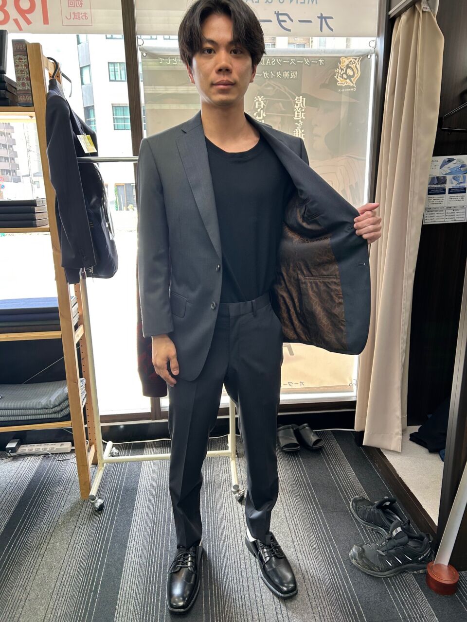 今人気のチャコールグレイスリムスーツを。 オーダースーツSADA 大阪谷町店 投稿日 2026年3月20日 NEW! 最終更新日 2026年3月20日 2ボタンシングルスーツ 生地素材 ・素材名 お試し ・色 グレー ・柄 ムジ ・シーズン 秋冬 ・生地番号 7-6563 裏地 ・素材名 ふじやま織 ・色 ブラウン ・柄 四つ葉 ボタン ・素材 水牛 ・色 こげ茶 オプションその他 ・PP加工 ・AMFステッチ 担当スタイリスト