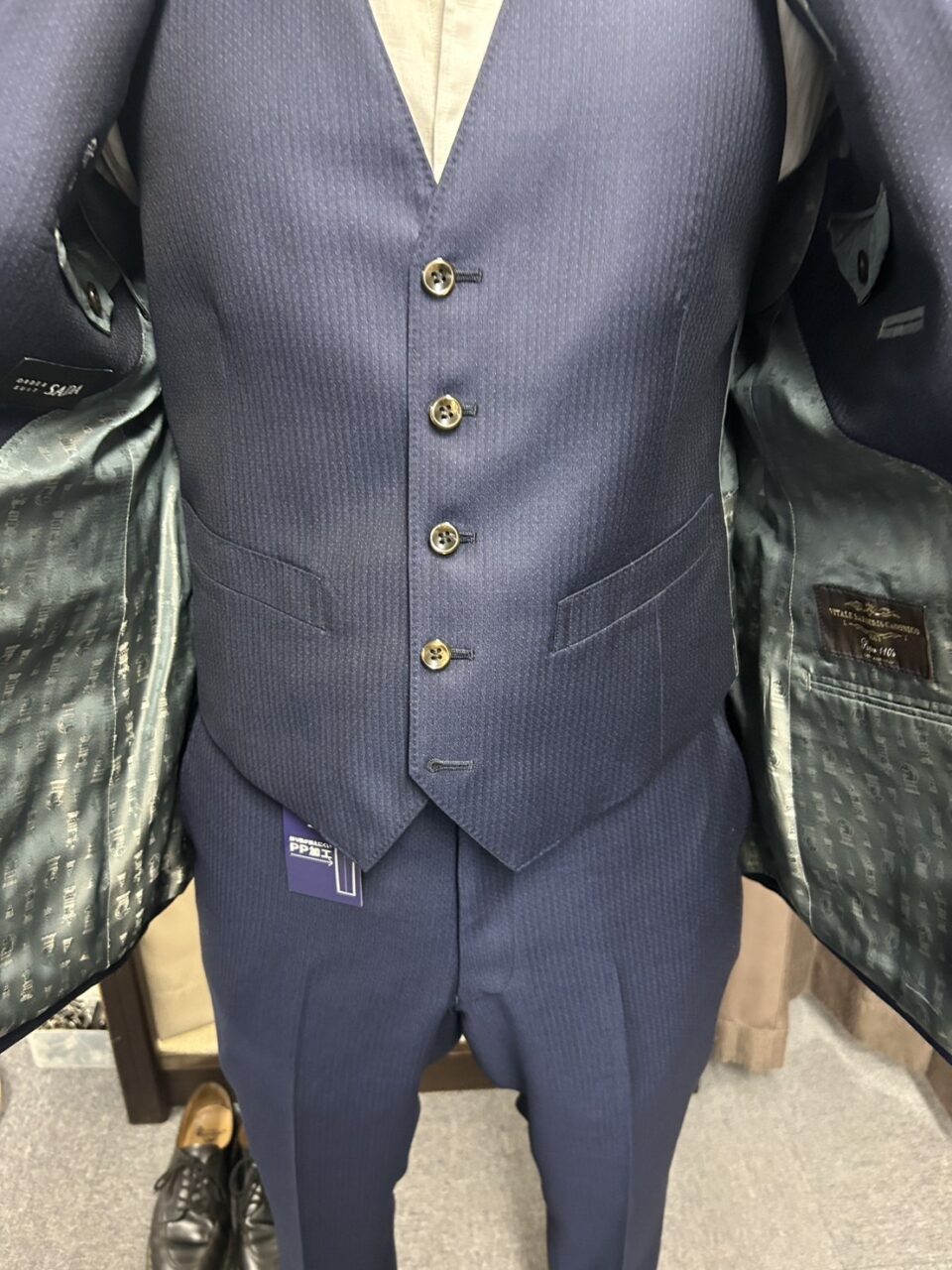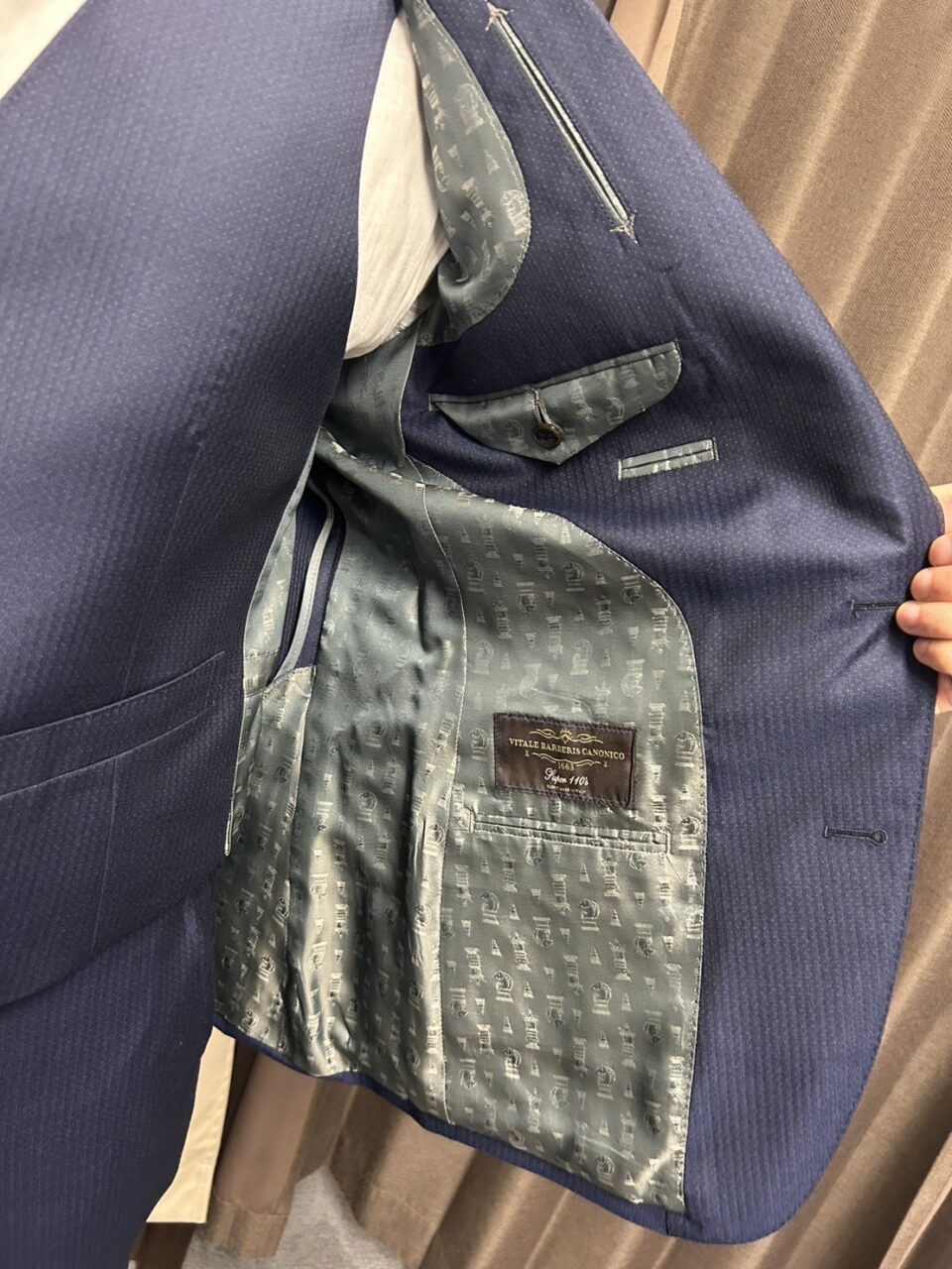 本日はイタリアのブランド「カノニコ」の紺の織柄の生地でお仕立てさせていただきました。