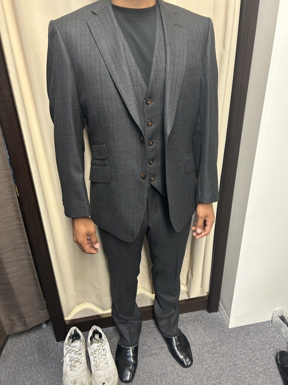 スーツの定番色であるチャコールグレーですが、ベストを付けることでより重厚感があるお仕上がりに。
