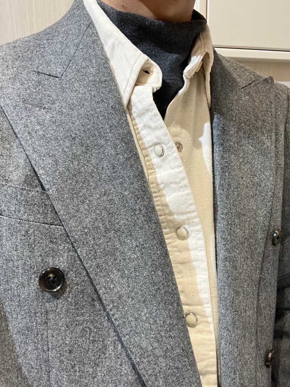 この日はチャコールグレーのモックネックのカットソーに、生成りのウエスタンシャツ、スエードのベルジャンシューズにノルディック柄のウールソックスと全体的に季節感を感じられるコーディネートを組んでみました。