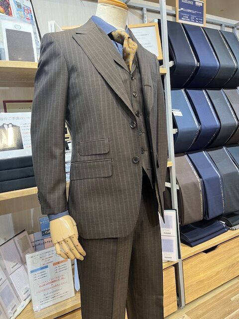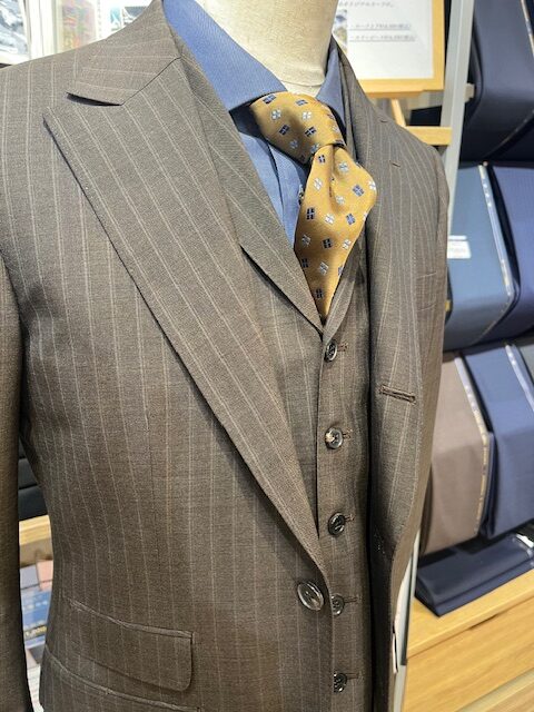 こちらはオリジナルファブリックのSuper100’sウールを使用した人気シリーズ【ELEGANCE】から、ブラウンストライプの生地を使用したスリーピーススーツです。