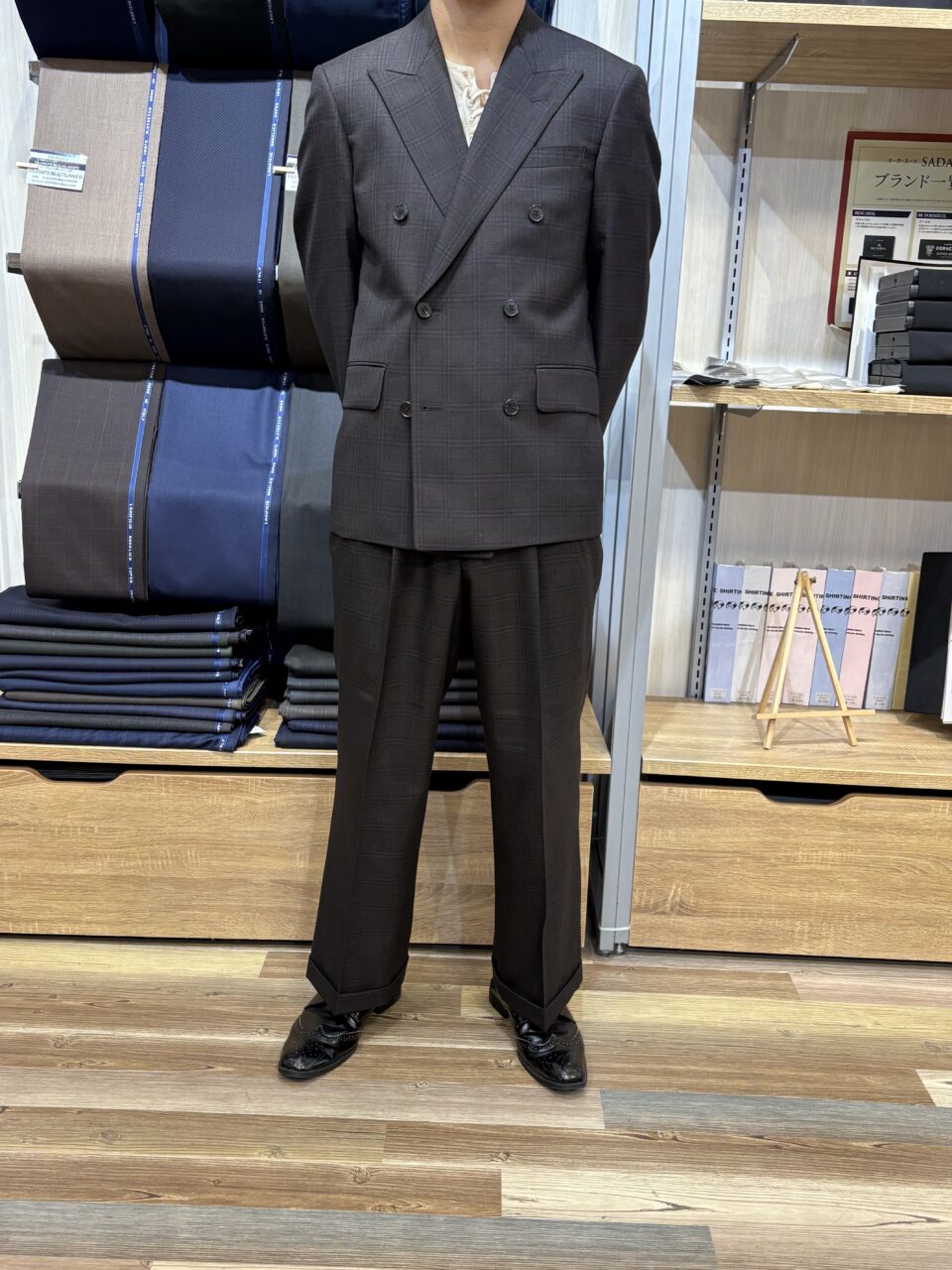 今回ご紹介するのはチェックのブラウンスーツをダブルでお仕立ていただいたお客様です。