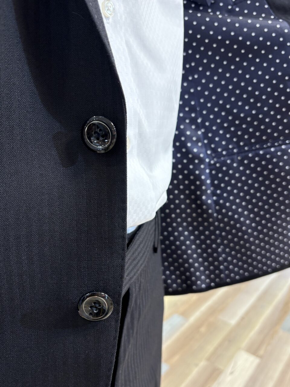 スーツの釦は特徴的なデザインのイタリア製光沢釦、裏地には爽やかなネイビー×ホワイトのドット柄をチョイス。