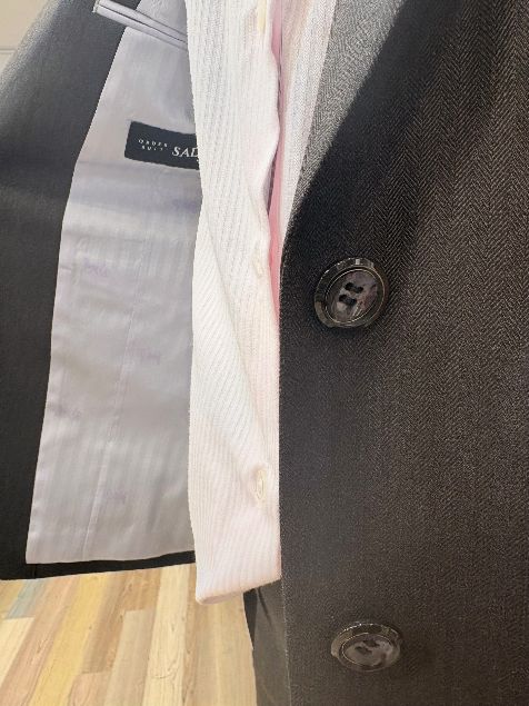 スッキリとクールなシルエットに、チャコールカラーのヘリンボーンストライプの持つ暖かみが合わさって上品なテイストのスーツに仕上がりました。