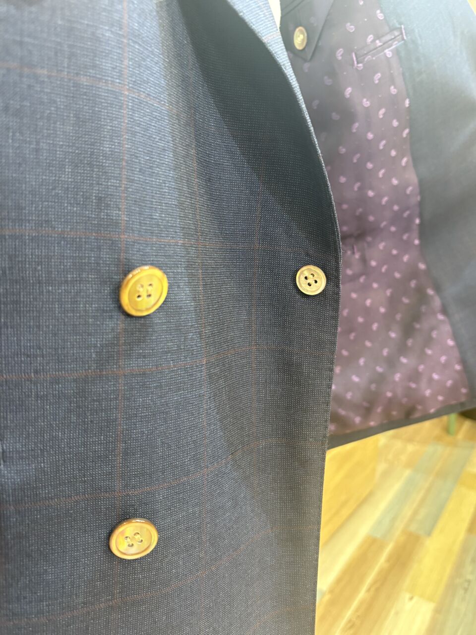 初めてのダブルスーツとのことでしたが、釦や裏地だけでなくステッチ、本切羽仕様や衿、袖口の色糸、チェンジポケットなど細部まで拘ってお選びいただきました。
