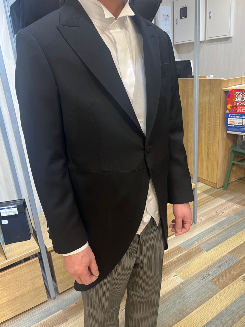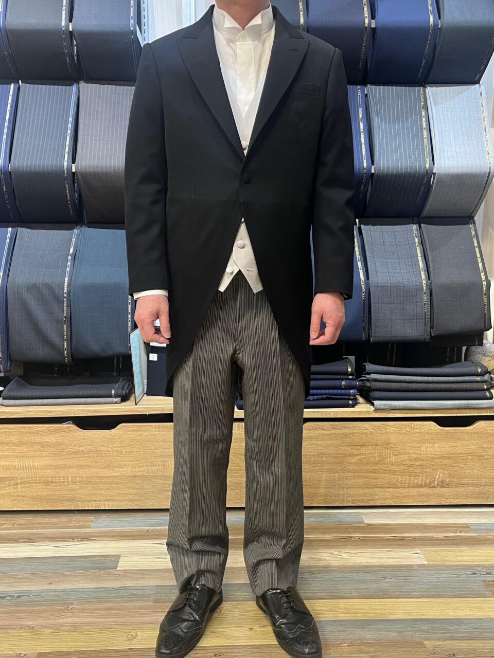 レンタルでは中々サイズが合わないことも多いモーニングコート、今回のお客様もレンタル用だとどうしても綺麗に合わないとのことでお仕立ていただきました。