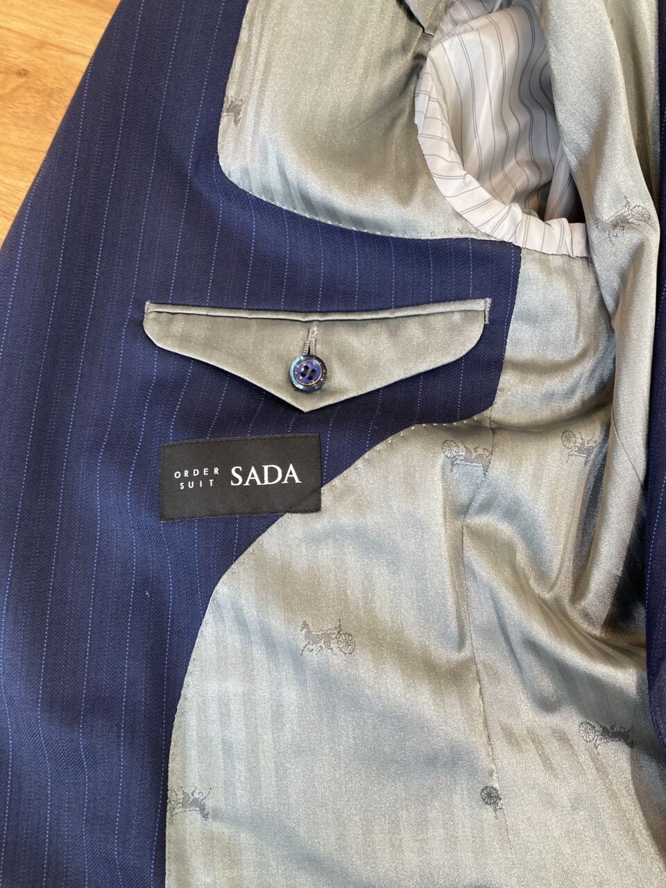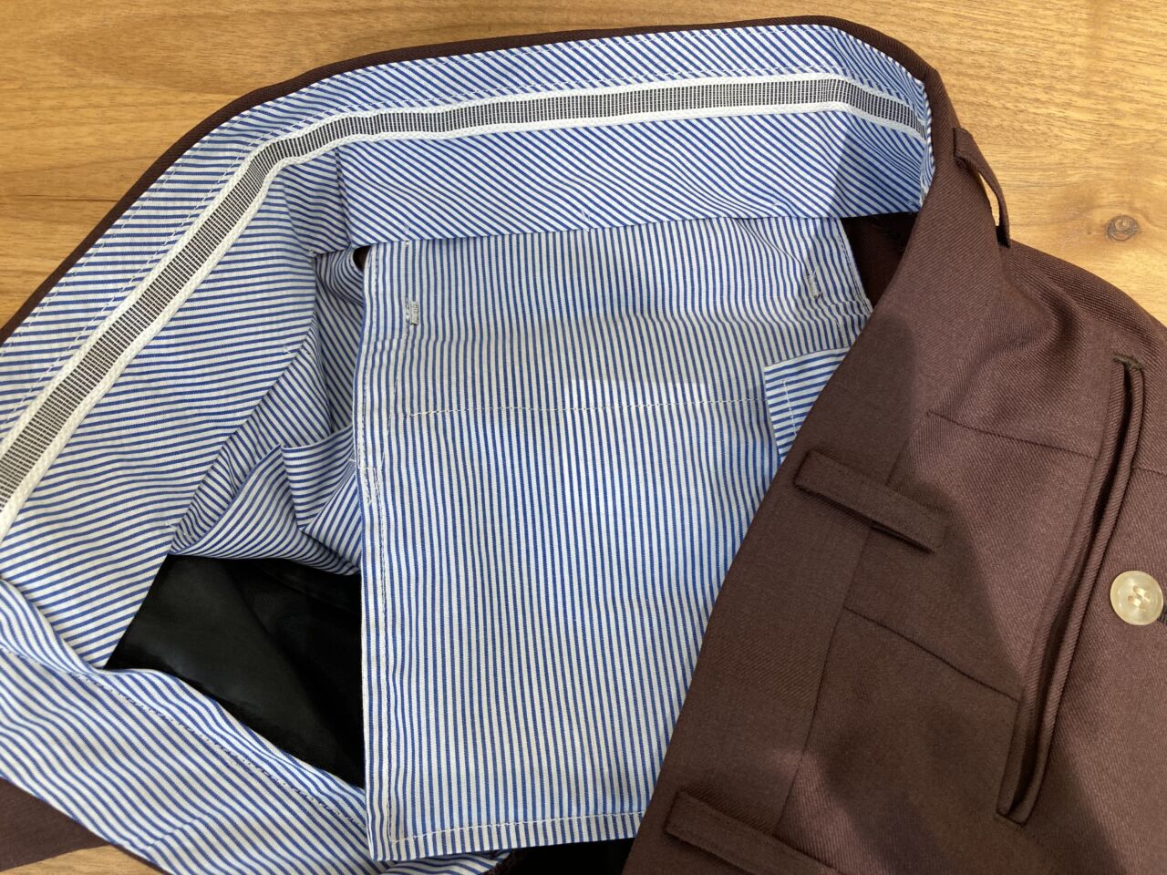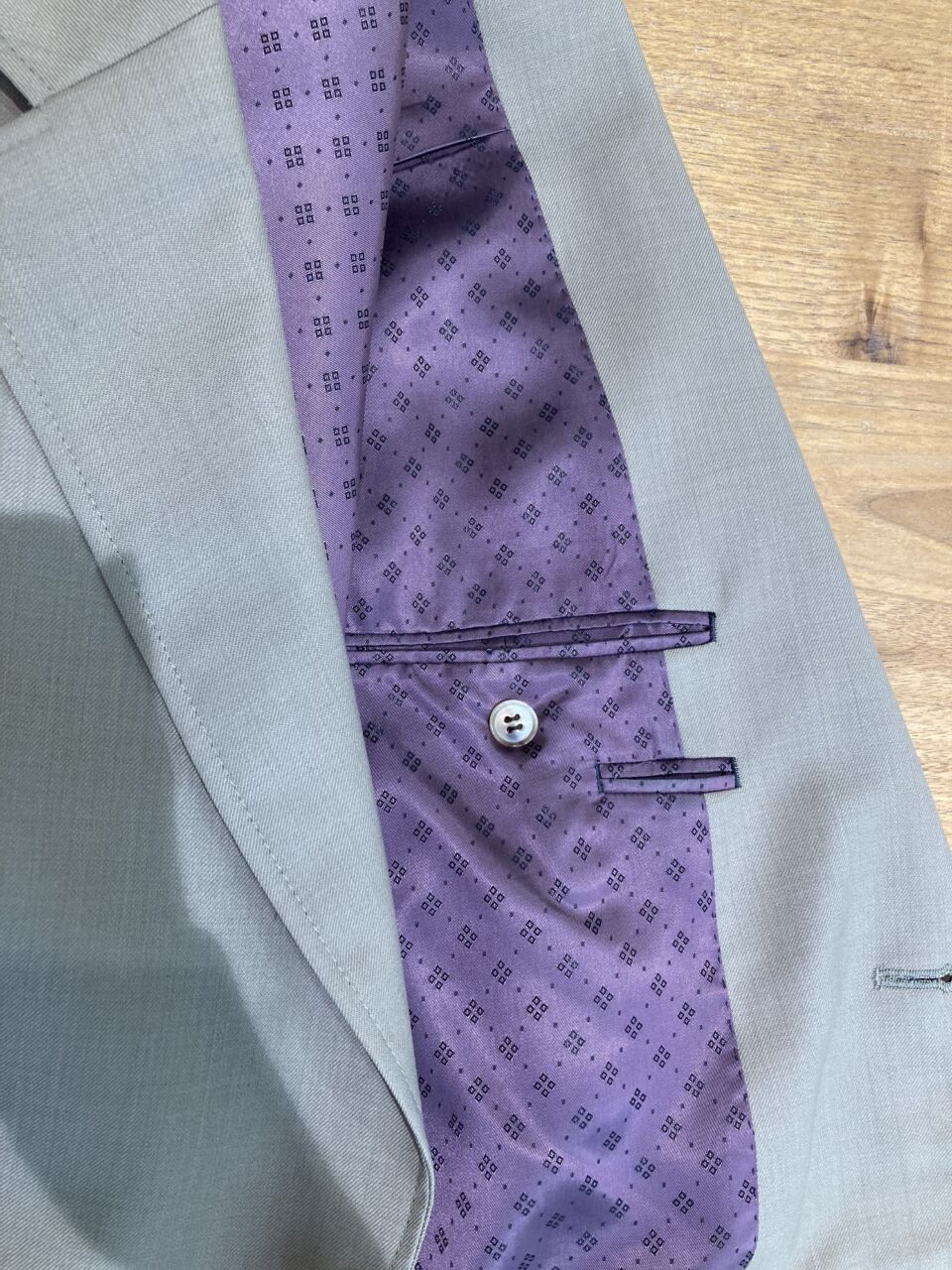 スーツの内側、内ポケットの周りにまで表地を使用します。