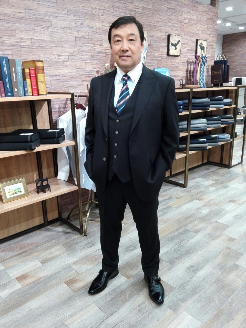 スーツの特徴:ブラックのシャドーストライプが角度によって綺麗な光沢が出るストライプ柄です✨