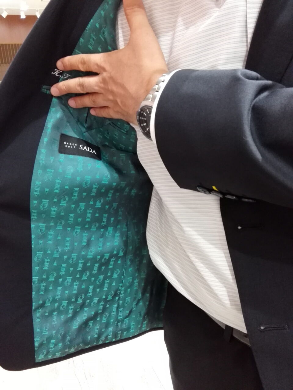 スーツの特徴:紺の無地に、裏地にグリーンのチェス柄・釦は光沢感のあるブルー・袖には黄色でアクセント付け、落ち着いた雰囲気の中にオシャレ感満載の1着になっています?✨