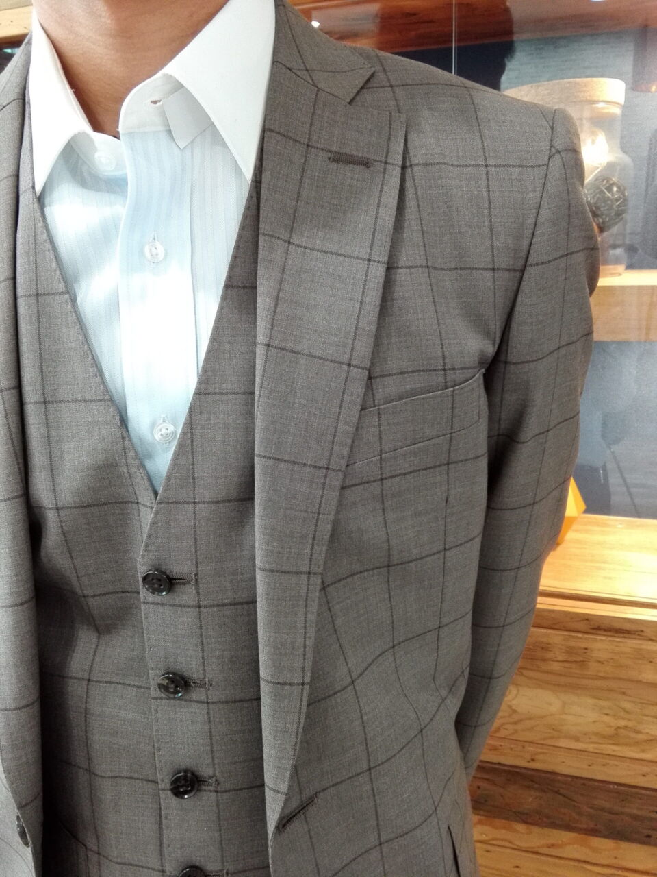 スーツの特徴:ベージュ系のウィンドウペンの柄に、濃いめの本水牛SB-123の釦なのでベストにもアクセントが付いています?
