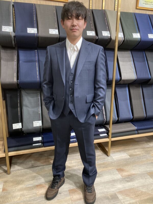 友人の結婚式用スリムフィットのスリーピーススーツ!! N.H様 オーダースーツSADA 札幌駅前通店 投稿日 2025年2月11日 最終更新日 2025年2月11日 この記事の内容は、2025年2月11日当時のものです。 公開から1年以上経過しています。(438日) こんにちは!札幌駅前通店です(*´▽`*) 本日もお客様の素敵なスーツをご紹介いたします。 2釦シングルスリーピーススーツ 生地素材 ウール50%・ポリエステル50% スタンダード素材 ネイビーチェック柄 秋冬生地 7-5515 裏地 ポリエステル100% レギュラー裏地 ネイビー60 ボタン レギュラー釦 ネイビー65 オプションその他 担当スタイリスト 土田