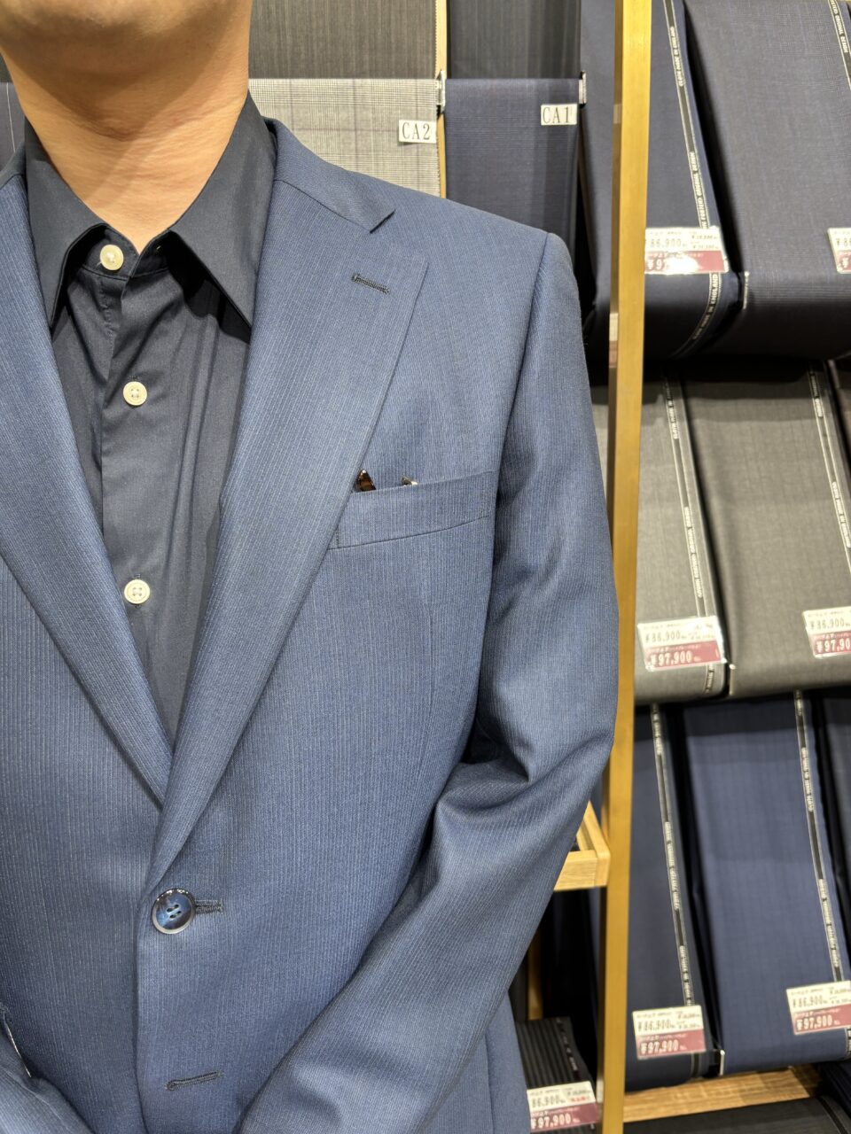 程よいゆとりでもスッキリとしたスタイルのブルー系ピンストライプスーツ T.T様 オーダースーツSADA 札幌駅前通店 投稿日 2025年9月25日 最終更新日 2025年9月25日 こんにちは!札幌駅前通店です(*^-^*) 本日もお客様の素敵なスーツをご紹介いたします。 2ボタン シングルスーツ 生地素材 ウール70%・ポリエステル30% 光沢感&ストレッチ素材 ブルー・ピンストライプ 春夏生地 7-1802 裏地 キュプラ100% ペイズリー柄 ホワイトSU663 ボタン セリエ釦 イタリー製 ベイビー F5 オプションその他 担当スタイリスト 梅内