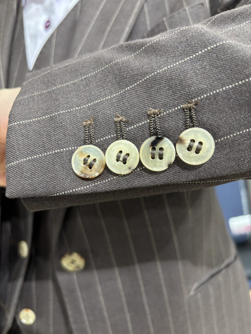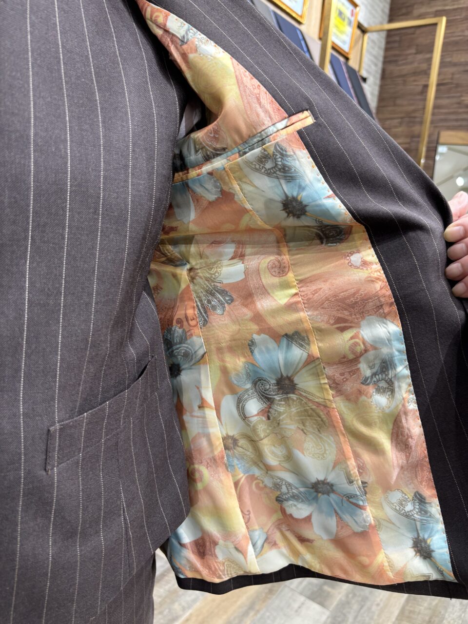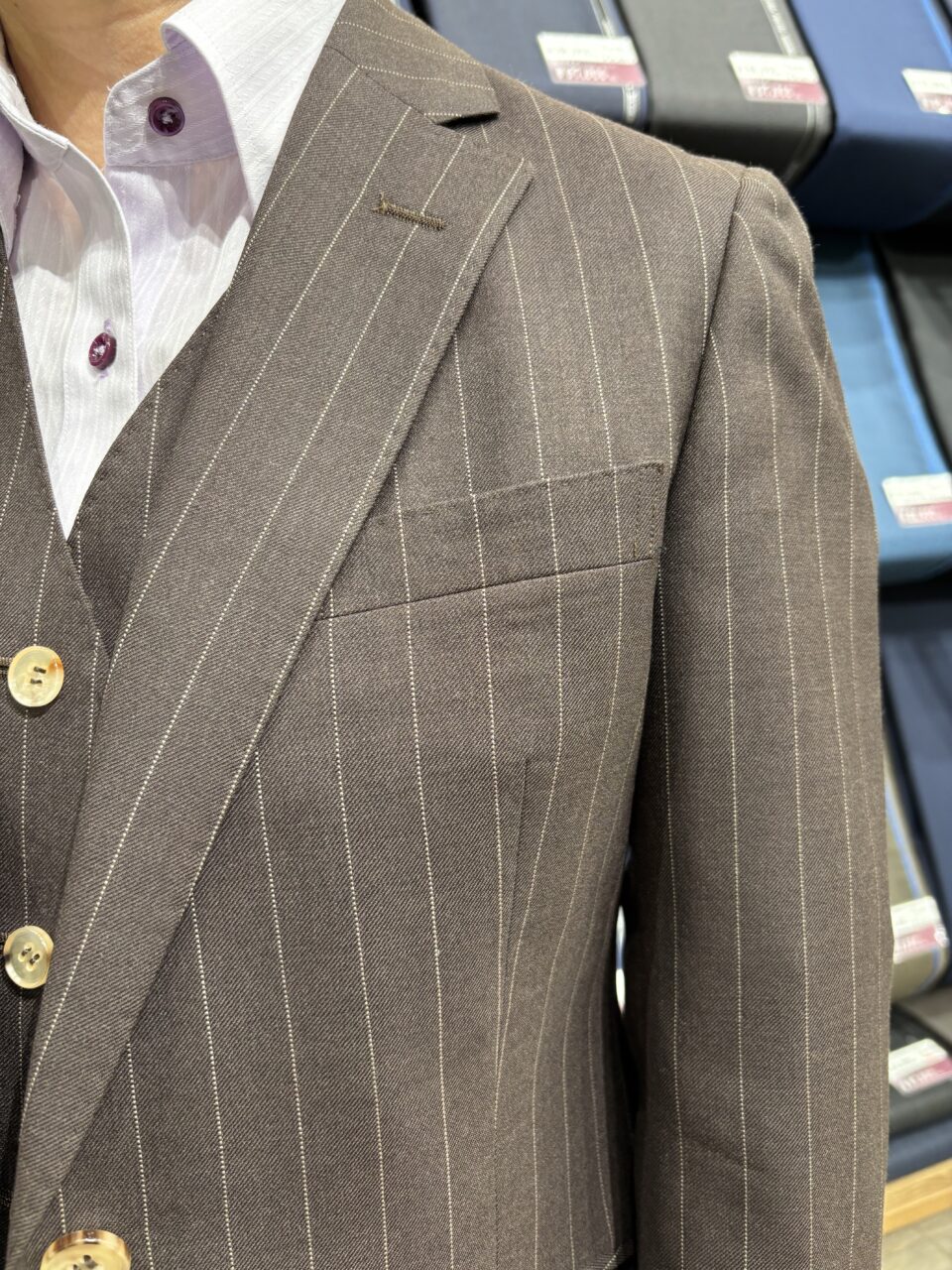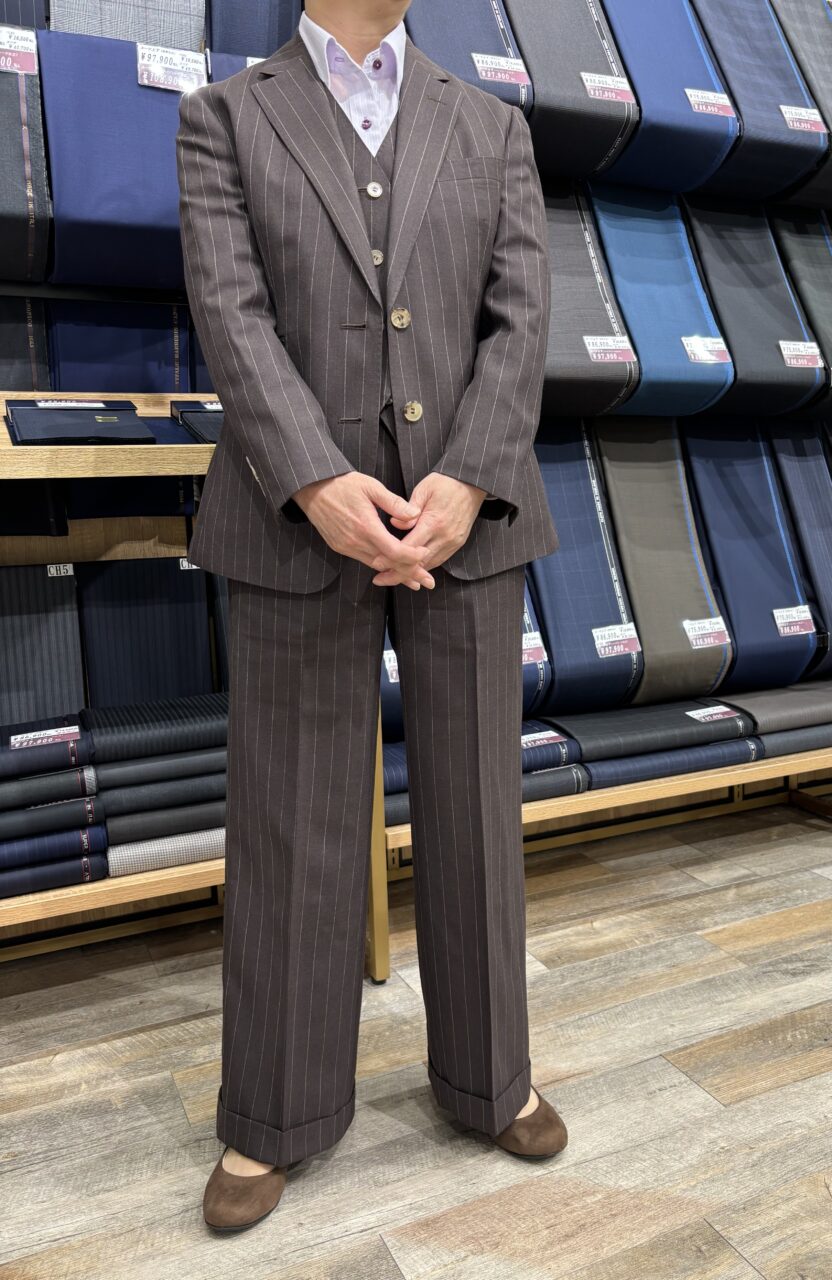 オーバーサイズのワイドパンツスーツ N様 オーダースーツSADA 札幌駅前通店 投稿日 2025年10月4日 最終更新日 2025年10月5日 こんにちは!札札幌駅前通店です(*^-^*) 本日もお客様の素敵なスーツをご紹介いたします。 2釦シングルスリーピーススーツ 生地素材 ウール100% スーパー100s’ ブラウン系ストライプ柄 秋冬生地 7-9833 裏地 キュプラ55%・ポリエステル45% オレンジ系花柄 TP7001W-55273-004-1 ボタン 本水牛 ベージュSB122 オプションその他 衿穴・AMFステッチ・本開き・内ポケット・ピンポイントステッチ 担当スタイリスト 梅内