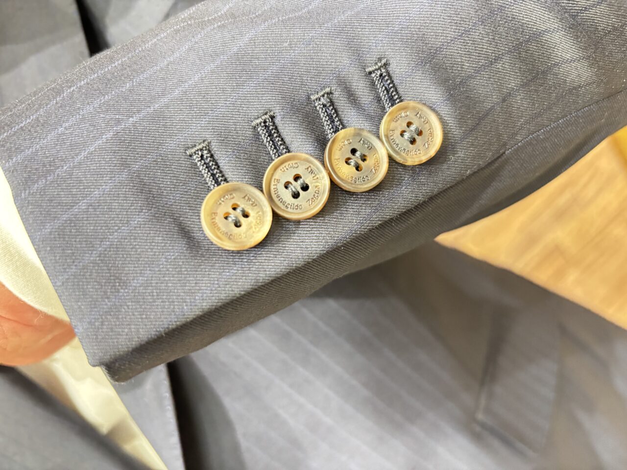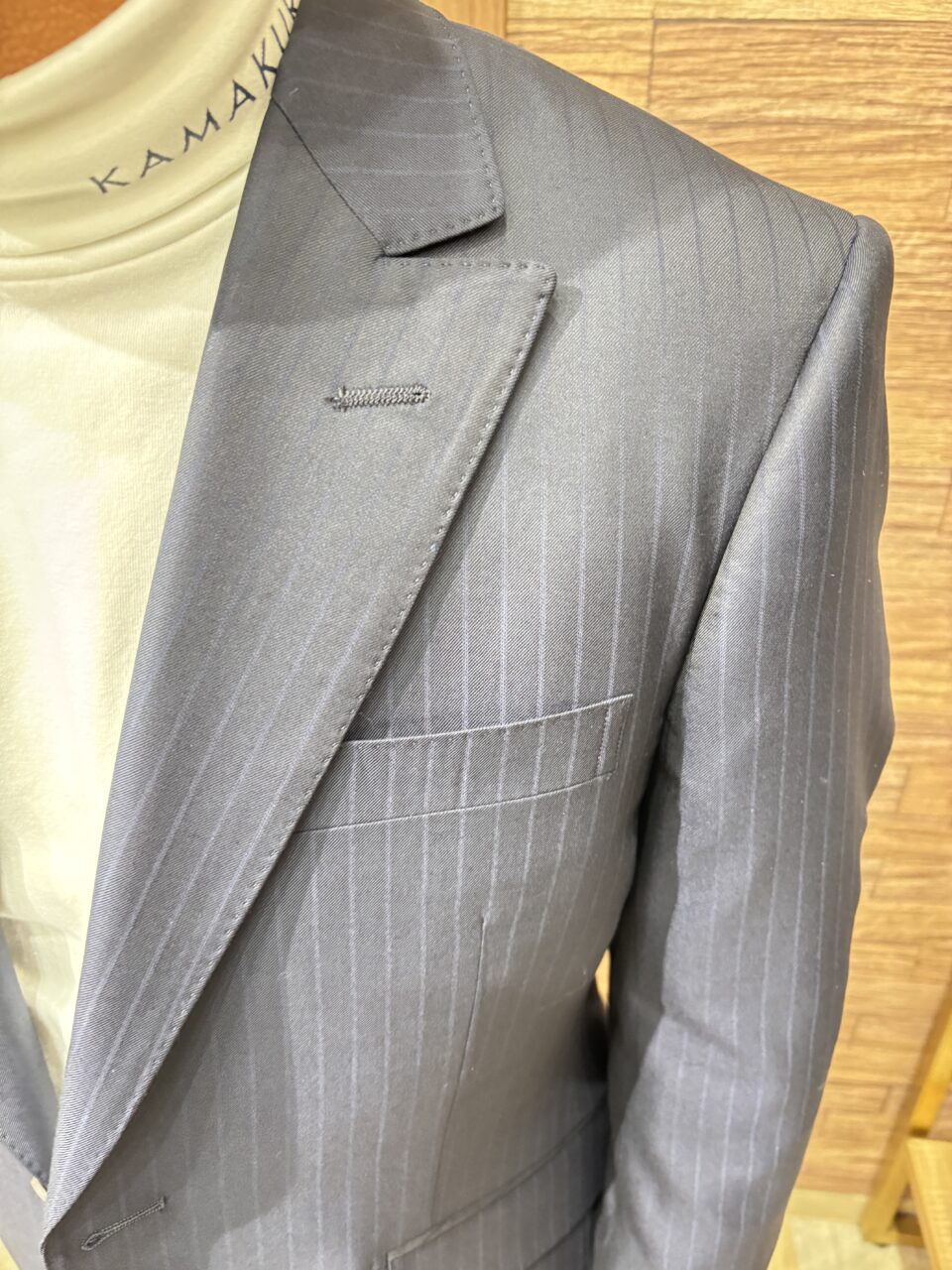 高級生地ゼニアを使用した上品な艶感のあるネイビーストライプスーツ