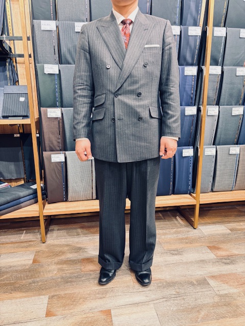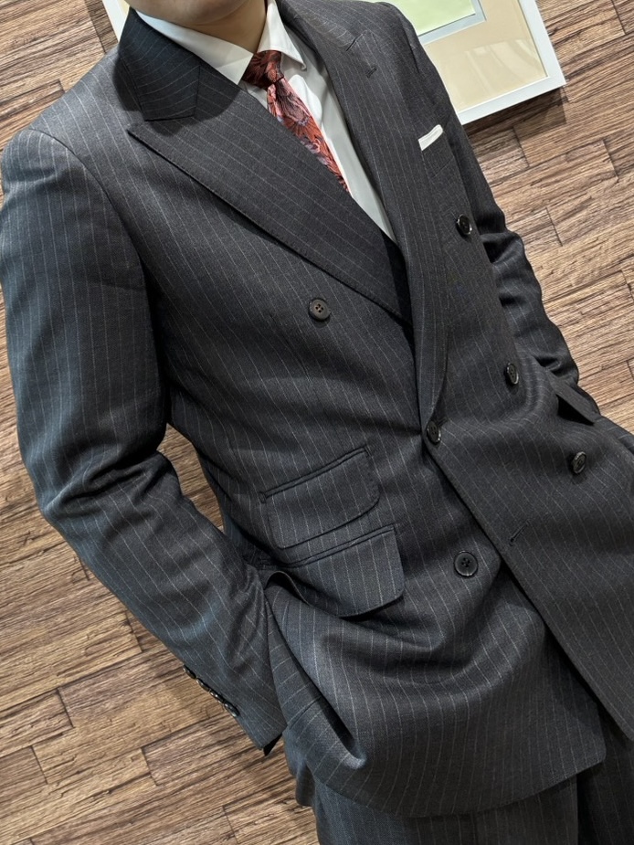英国生地で仕立てたブリティッシュスタイルのダブルスーツ K.S様/40代 オーダースーツSADA 札幌駅前通店 投稿日 2026年3月1日 NEW! 最終更新日 2026年3月1日 こんにちは!札幌駅前通店です(*^-^*) 本日もお客様の素敵なスーツをご紹介いたします。 ダブルブレスト6×2ボタンスーツ 生地素材 ウール100% 英国製ジョンフォスター グレーストライプ 秋冬生地 6-4526(75849) 裏地 キュプラ100% 無地 ボルドー SU808 ボタン 本水牛 黒 SB124 オプションその他 サスペンダー釦 ベルトレス3.5巾 ループなし 担当スタイリスト 水口