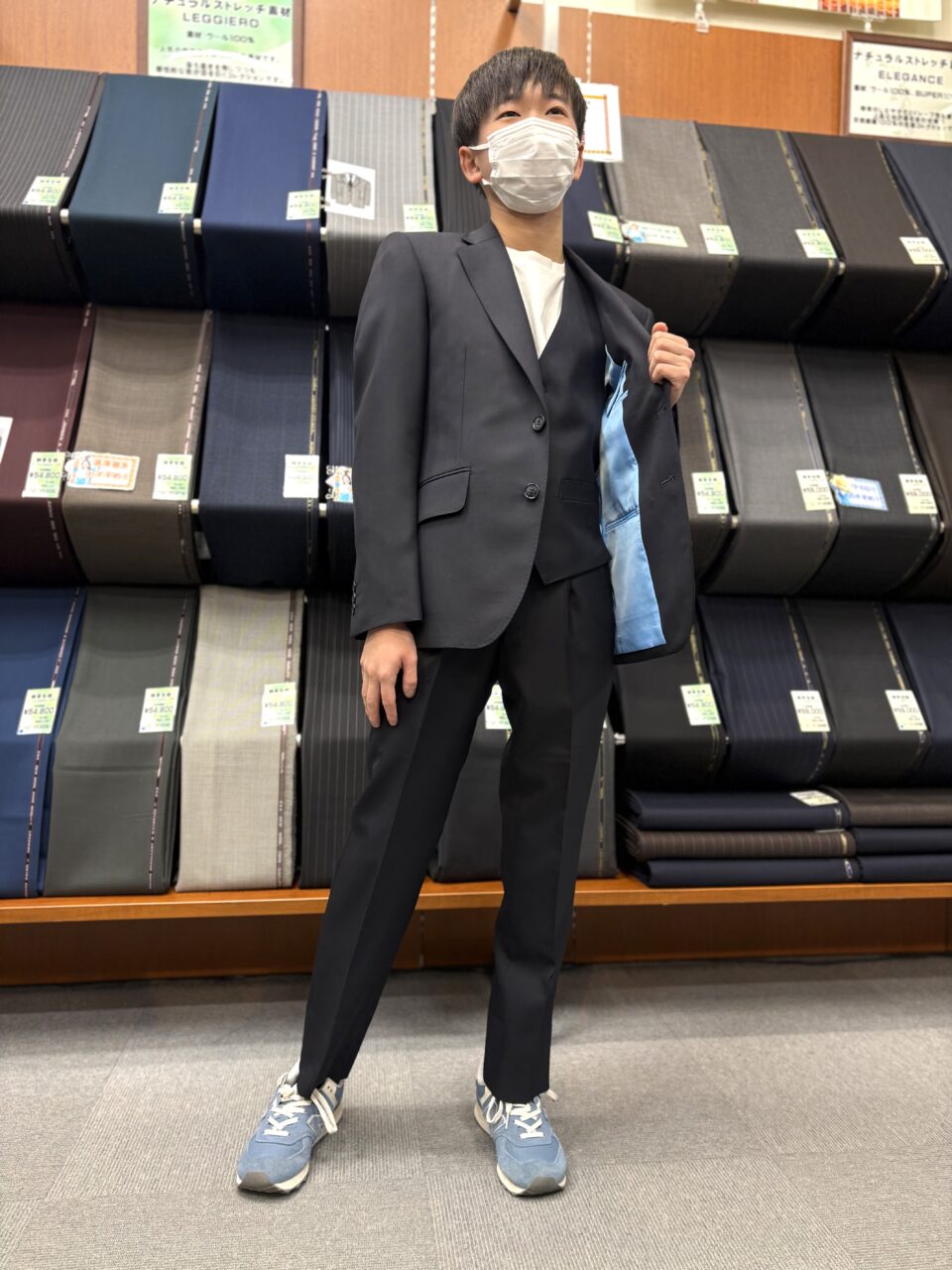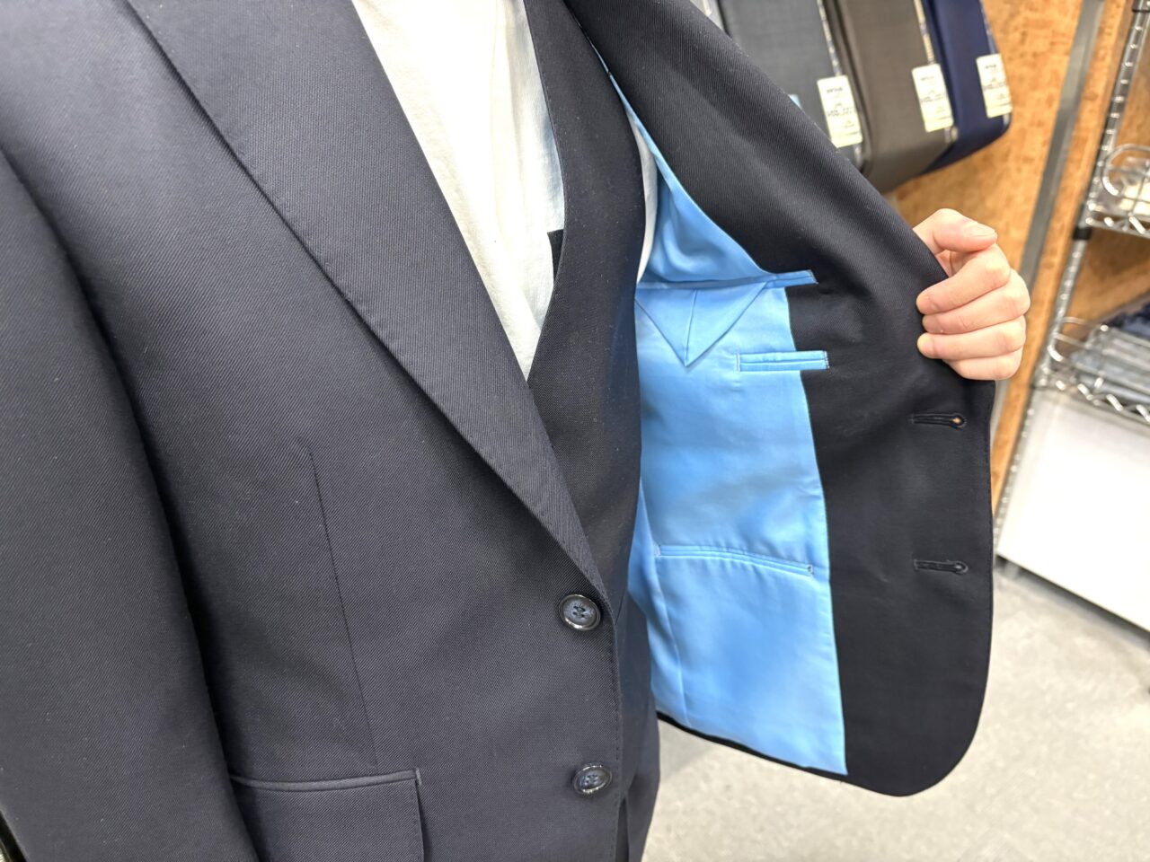 ダークスーツに水色の裏地で遊び心をプラス オーダースーツSADA 仙台泉店 投稿日 2026年1月31日 NEW! 最終更新日 2026年1月31日 スリーピーススーツ 生地素材 素材:ウール50%、ポリエステル50% 色:ネイビー 柄:無地 シーズン:秋冬 生地番号:7-5502 裏地 素材:ポリエステル100% 色:水色 柄:無地 ボタン 色:ネイビー オプションその他 AMFステッチ 担当スタイリスト 菅野