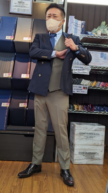 釦を外してベストを見せても、ジャケットなしでも決まるので、