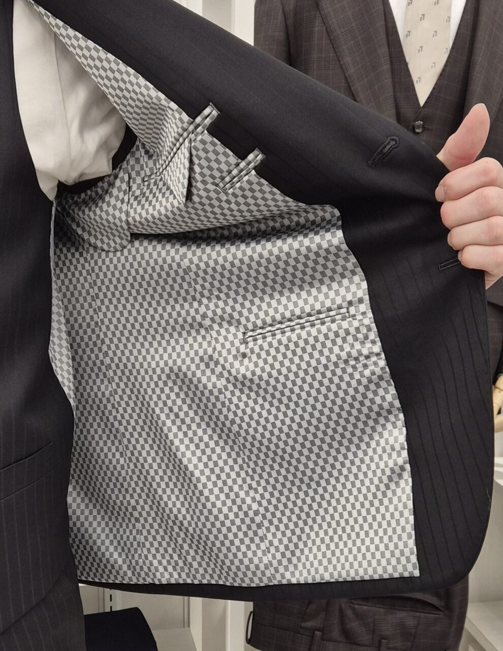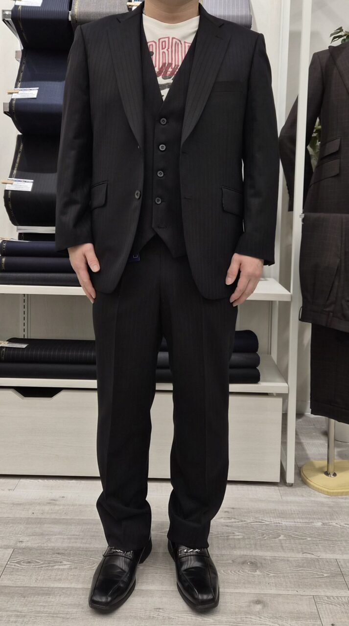 黒のシャドーストライプでよりシャープに K.T様/男性 オーダースーツSADA 静岡駅前店 投稿日 2026年1月27日 NEW! 最終更新日 2026年1月27日 裏地や釦は同系色のグレー系でまとめていただき 統一感のあるコーデになりました! 2ボタン スリーピーススーツ 生地素材 FORTE ウール100% 黒系 シャドーストライプ 7-6546 裏地 ポリエステル60% キュプラ40% 市松模様 グレー系 SU719 ボタン Gボタン グレー系 ダークトーン G98 オプションその他 本開き タフ仕立て アジャスター 担当スタイリスト 吉崎