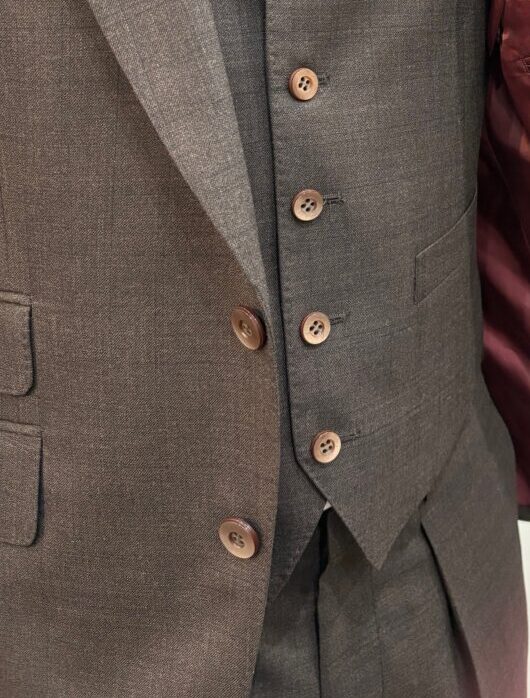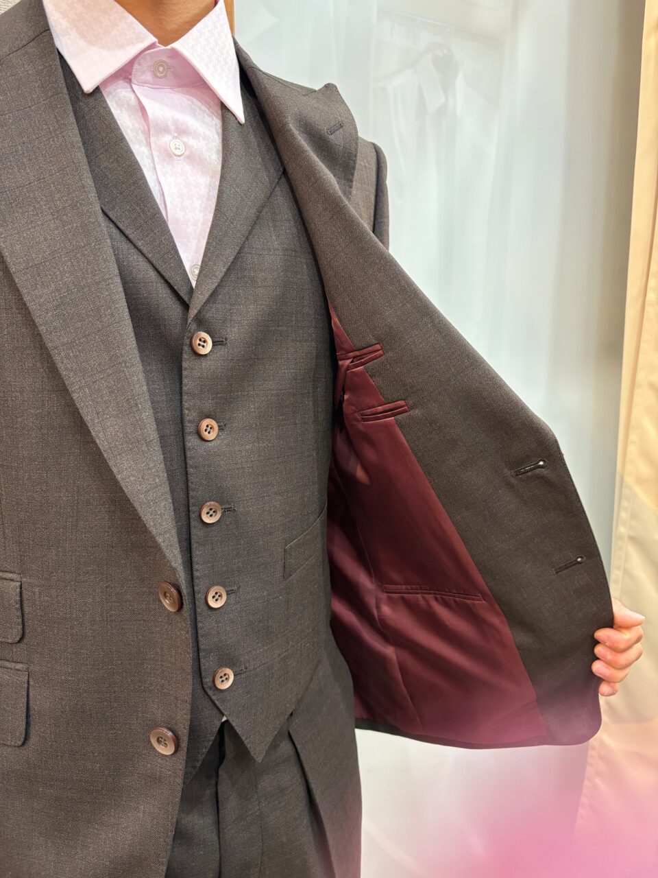 裏地も合わせてボルドーで、ボタンは明るめの茶のほど良い光沢感があるのでスーツが重くなりすぎなくてちょうどいいバランスです。