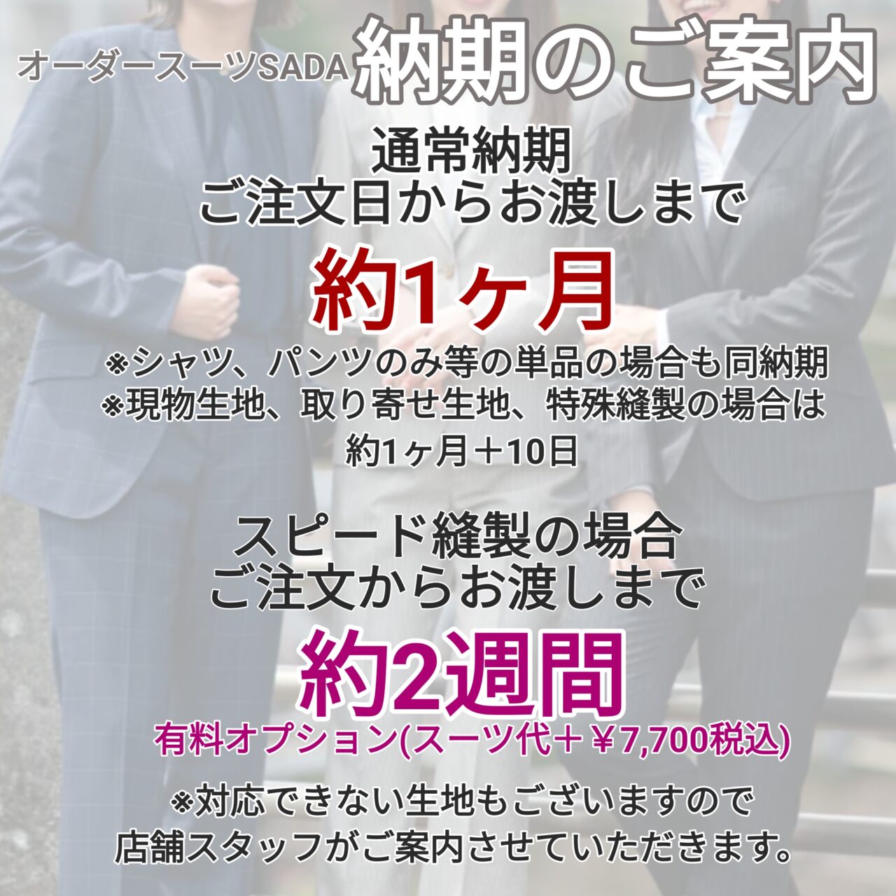 生地の入れ替えのタイミングにもなりますので、ビジネスや冠婚葬祭用にご検討されるお客様も重なり、ご注文も多くなる時期ではございますので、店舗スタッフ、縫製工場もフル稼働でご対応させていただいておりますが、人気の生地が品薄になったり、納期が遅れて間に合わなかったり等もございますので余裕をもってのご注文をお願い致します。