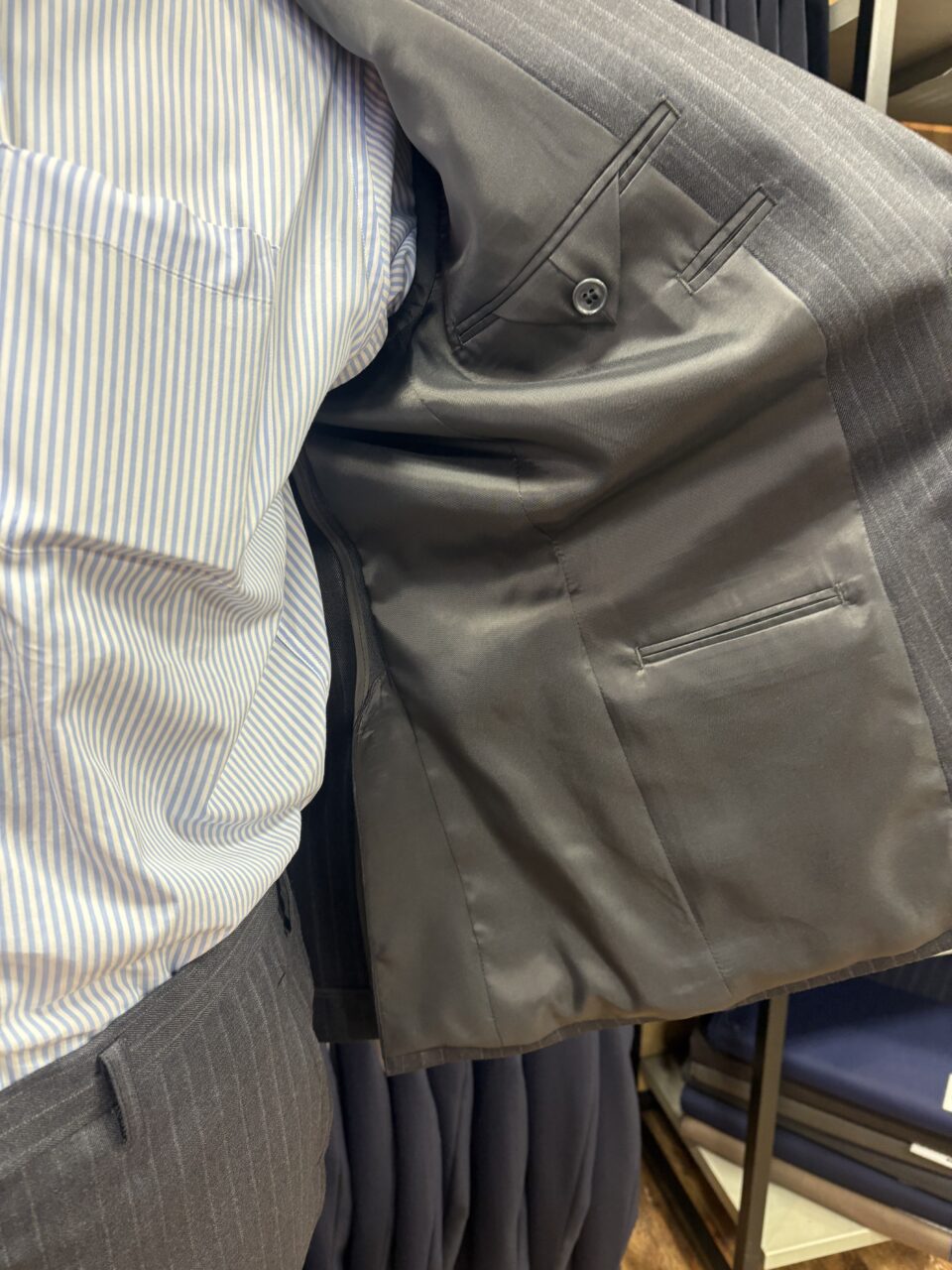 グレー/ストライプの生地でお仕立て頂きました。 H.K様/60代/男性 オーダースーツSADA 宇都宮大通り店 投稿日 2025年10月20日 NEW! 最終更新日 2025年10月16日 2ボタン シングルスーツ 生地素材 ウール100% グレー ストライプ 秋冬生地 7-5551 裏地 ポリエステル100% No.333 ボタン M釦 NO.09 オプションその他 担当スタイリスト 藤井