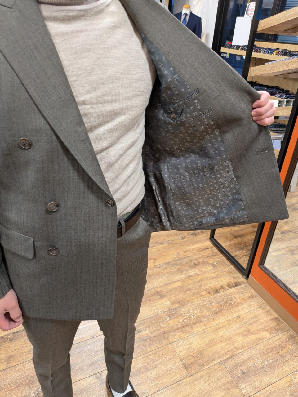 ダブルスーツお仕立ていただきました。 S.S様/20代/男性 オーダースーツSADA 宇都宮大通り店 投稿日 2026年1月29日 NEW! 最終更新日 2026年1月29日 6×2ボタン ダブルスーツ 生地素材 ウール100% グレー ストライプ 秋冬生地 39401-74 裏地 キュプラ100パーセント チェス柄 ブラウン ボタン 標準ボタン ブラウン オプションその他 担当スタイリスト 小田林