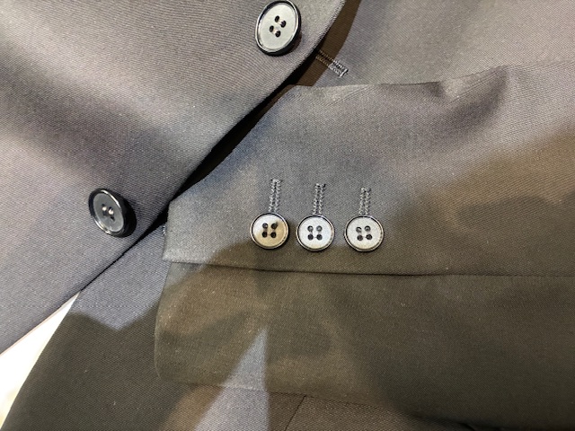 お袖の釦もビジネスですと最近は4個が多いですが、礼服ですと3つの傾向が強いです。
