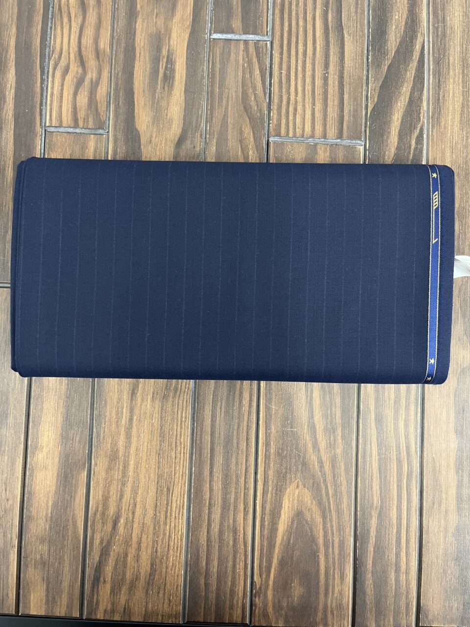こちらは紺のストライプ生地となっております。ストライプ幅が広いのが特徴的でクラシックなスーツデザインでお作りするとかっこよく仕上がります!